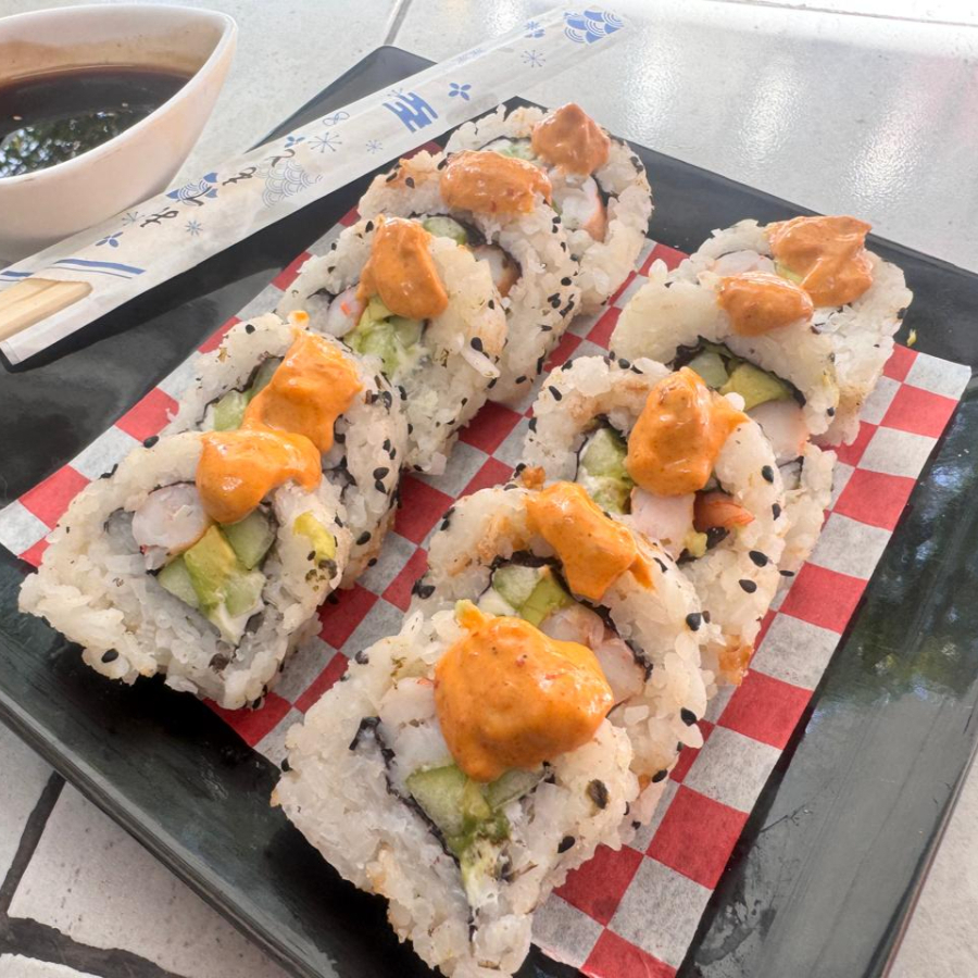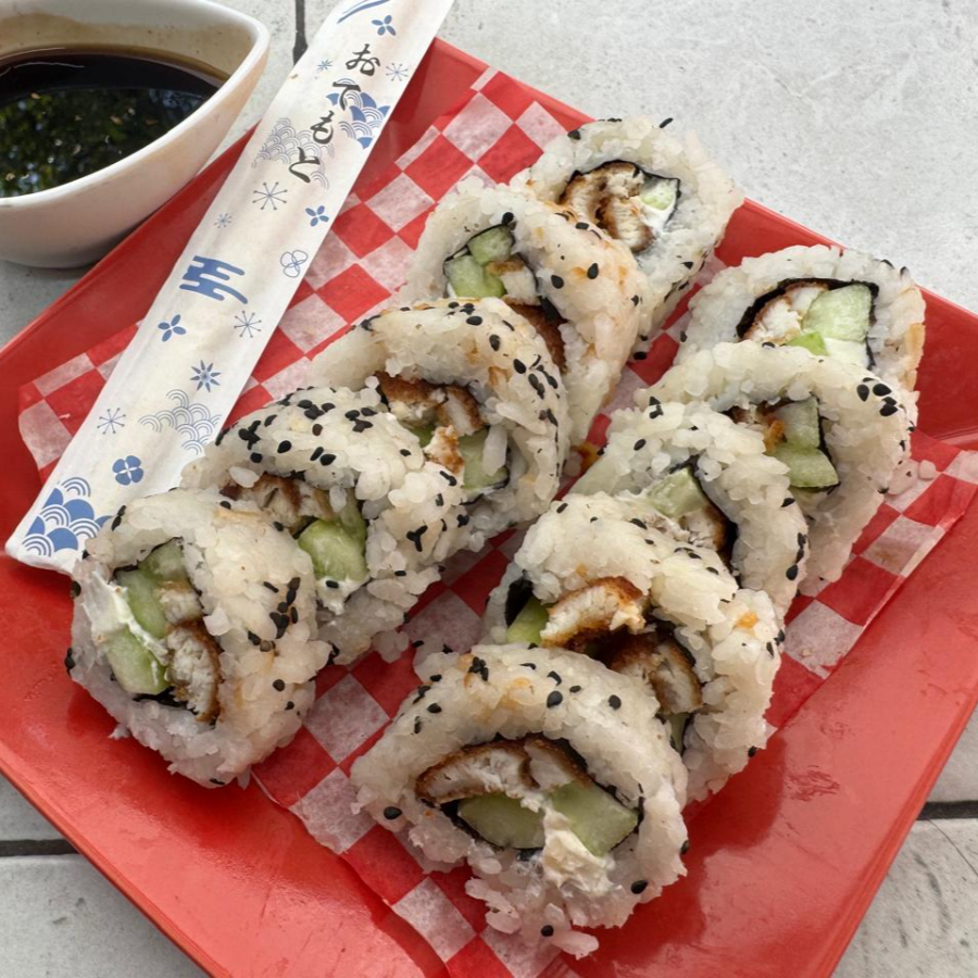 Por dentro: Queso philadelphia, pepino, aguacate y camaron. Por fuera: Salsa de chipotle