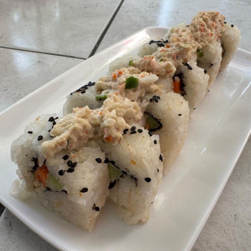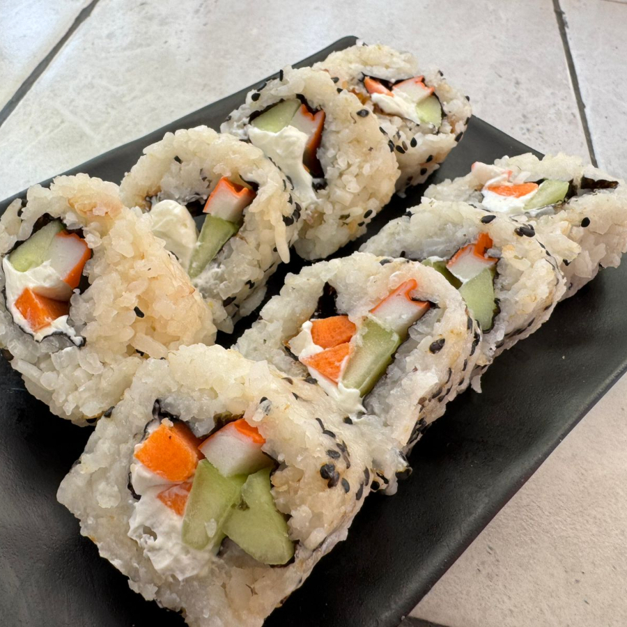 Por dentro: Queso philadelphia, pepino, zanahoria y surimi. Por fuera: Aguacate