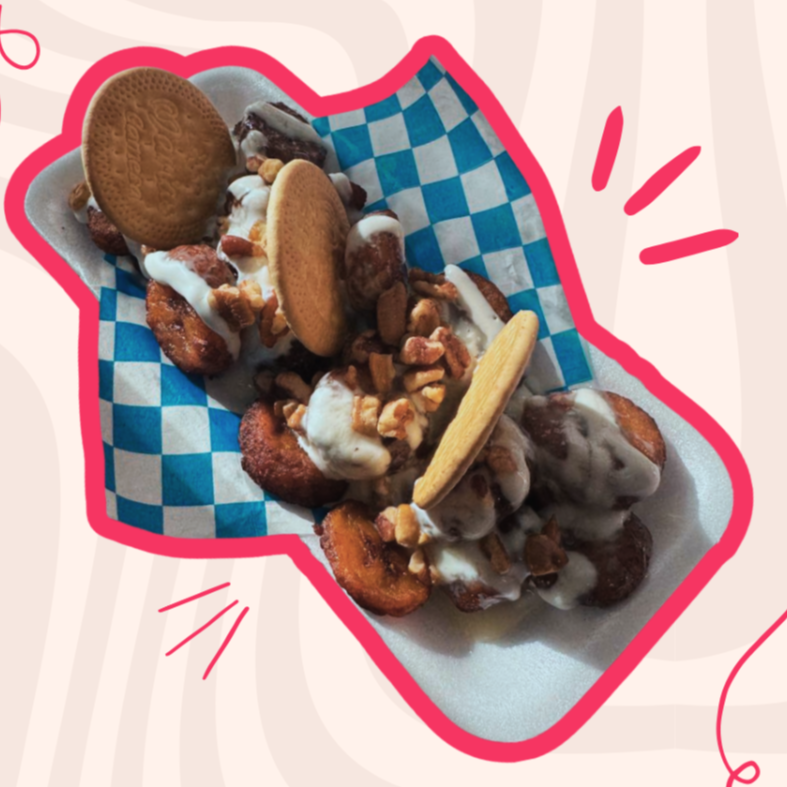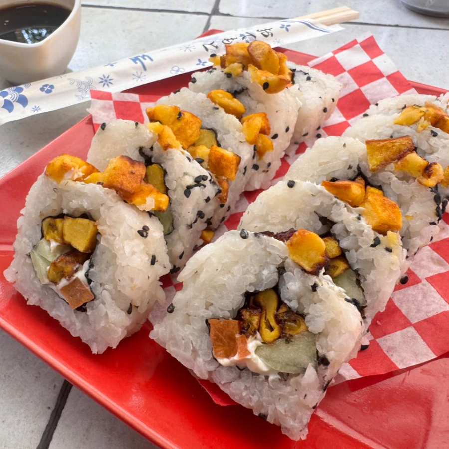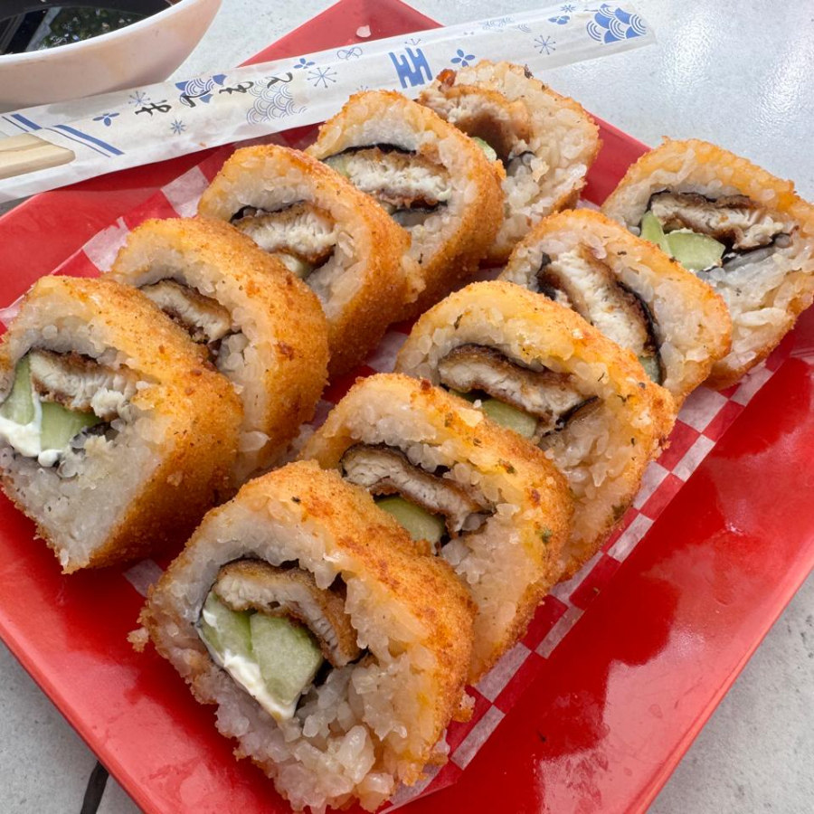 Por dentro: Queso philadelphia, pepino y zanahoria. Por fuera: Platano frito