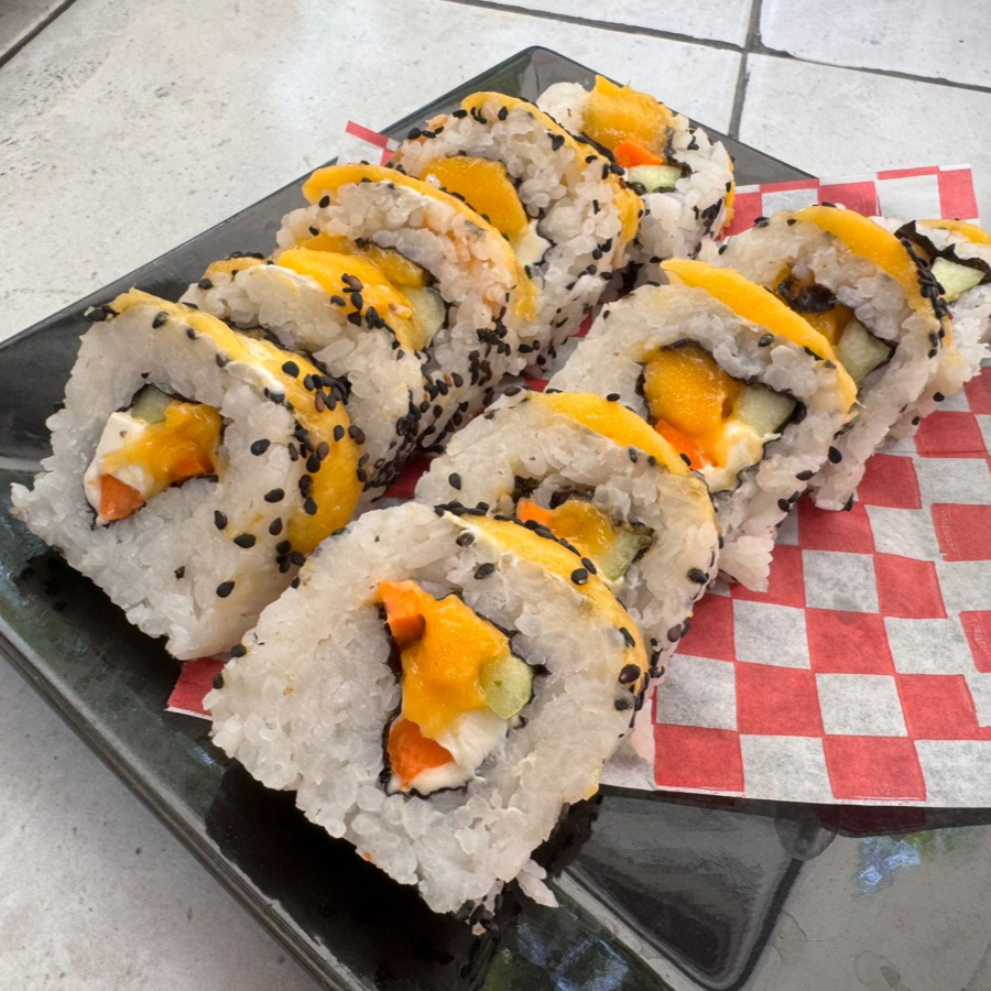 Por dentro: Queso philadelphia, pepino y zanahoria. Por fuera: Mango