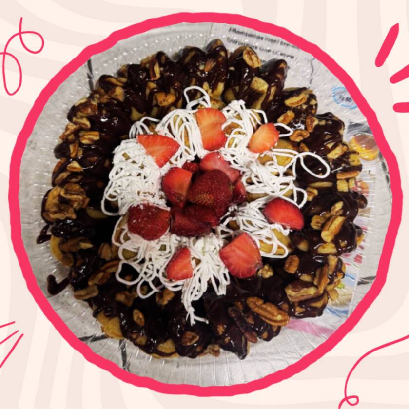 Nuestra rosca de mini hot cakes es el centro de mesa perfecto que combina sabor, esponjosidad y diversión. Con 45 piezas de mino hot cakes con fruta, untable y topping de tu preferencia.