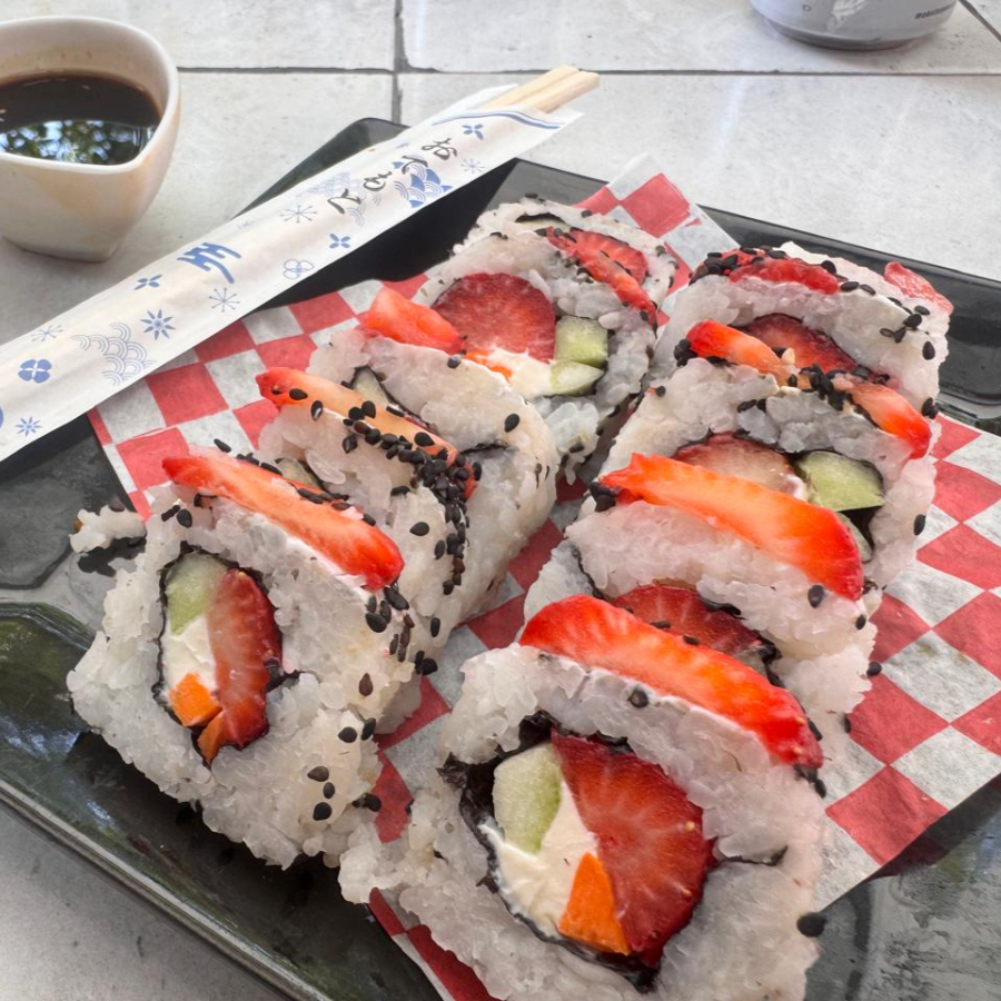 Por dentro: Queso philadelphia, pepino y zanahoria. Por fuera: Fresa