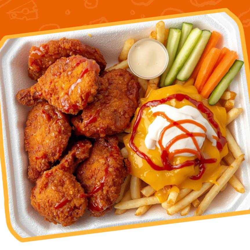 500 g de boneless + 200 g de papas Incluye pepino, zanahoria y 1 dip.
