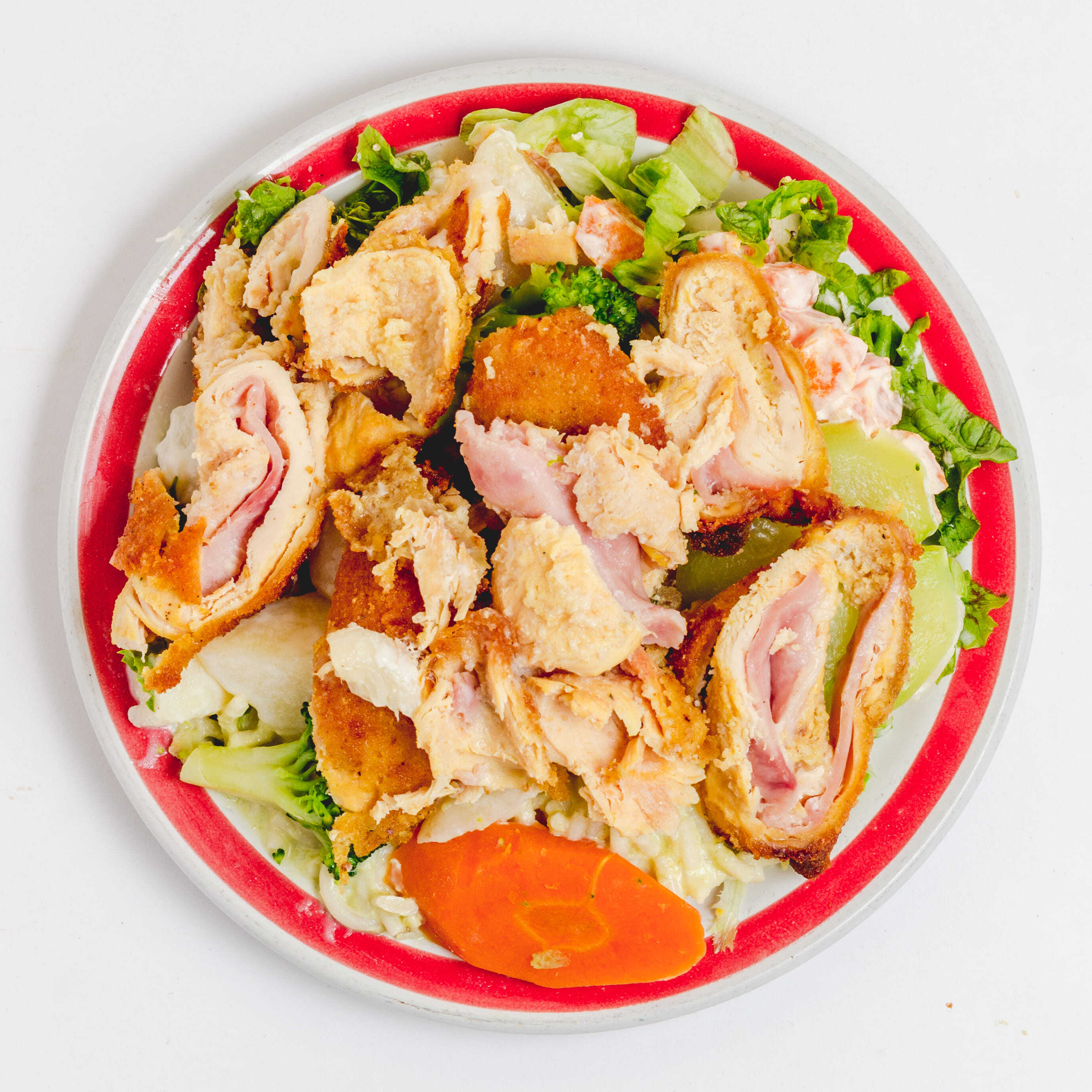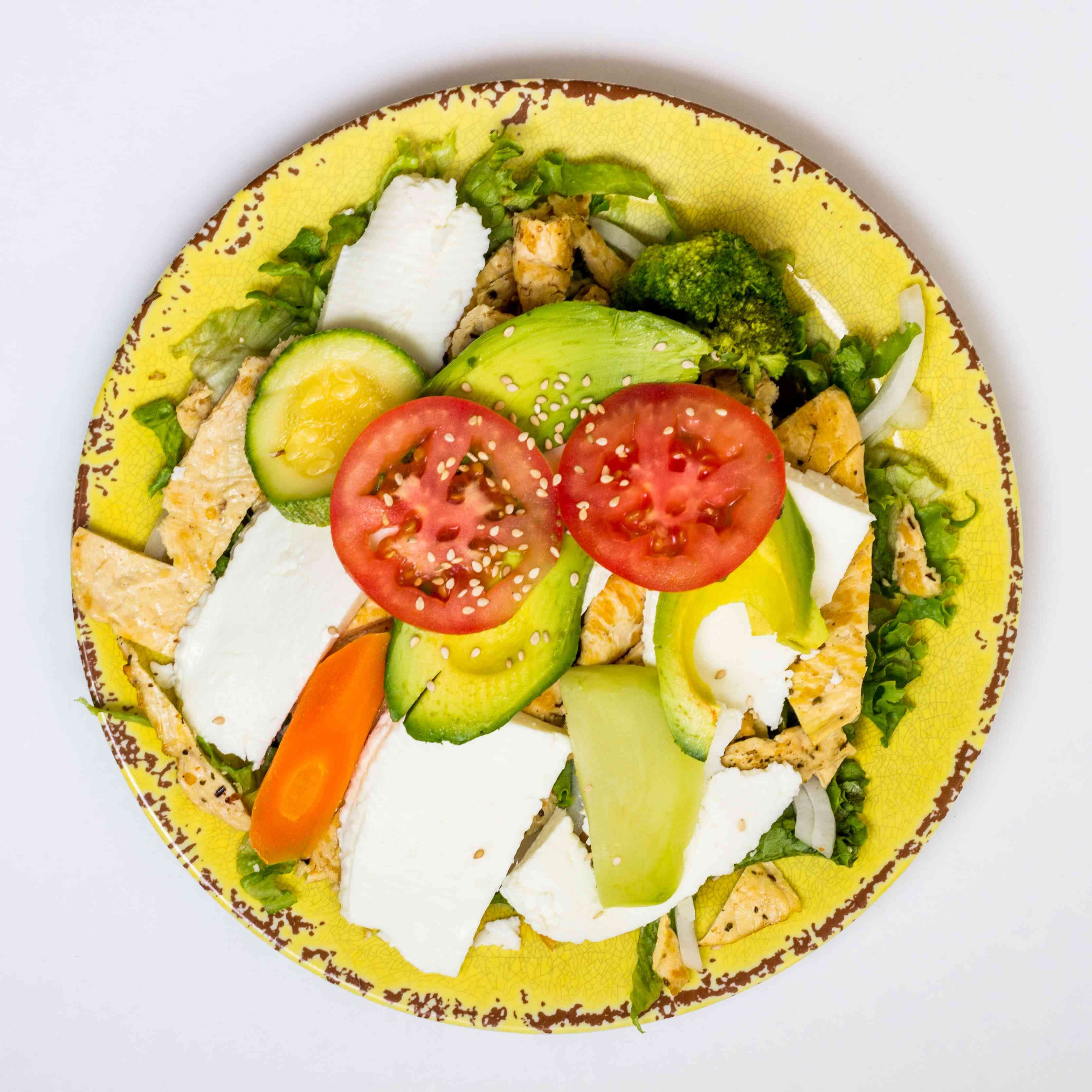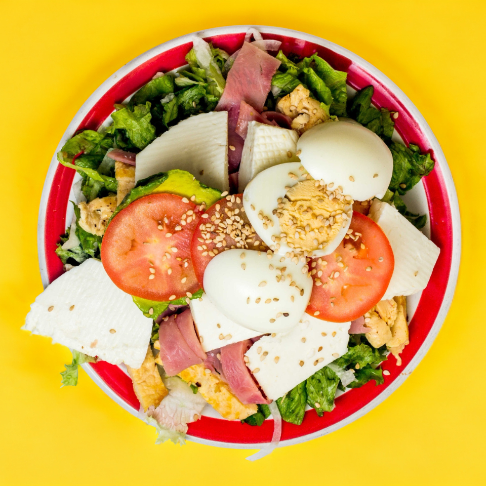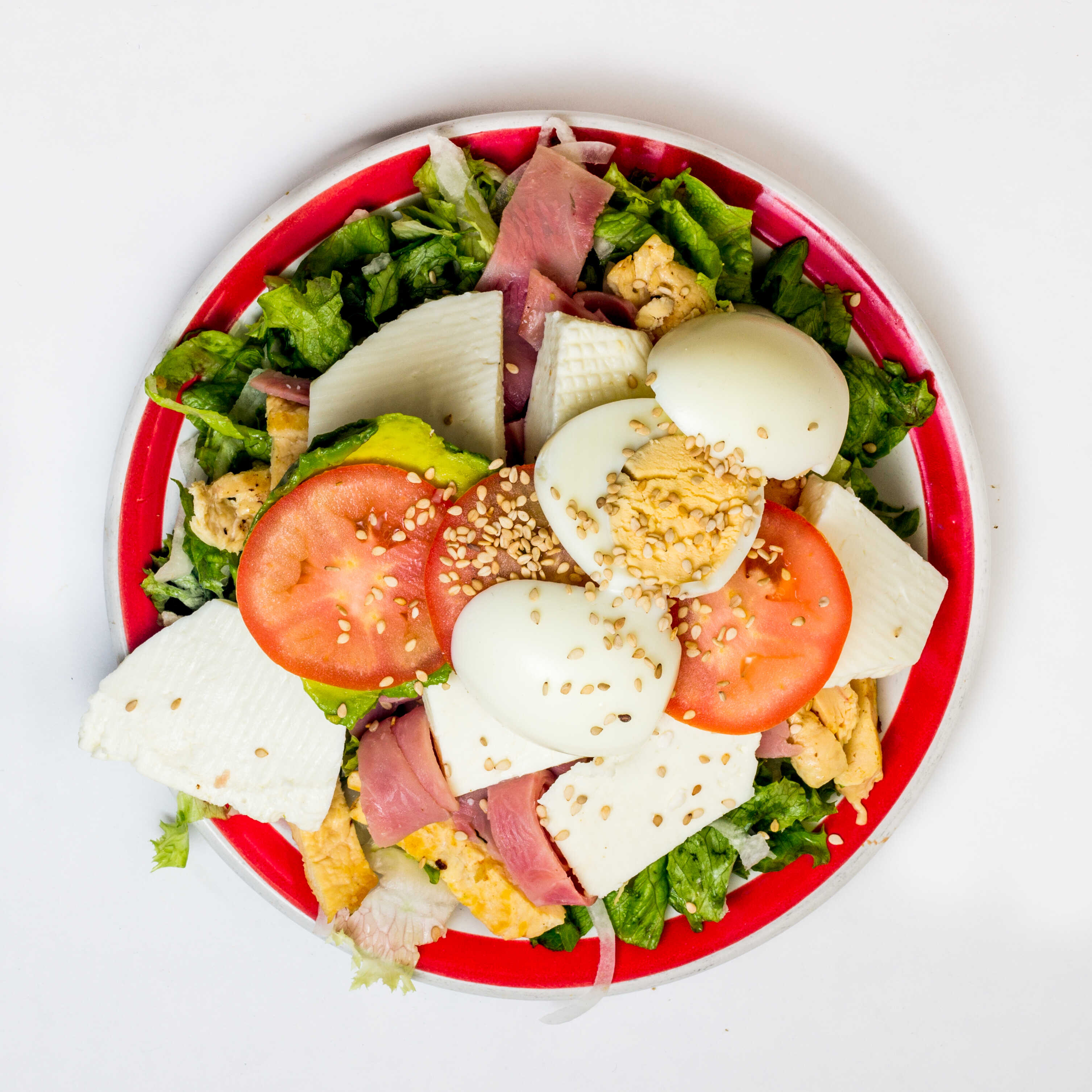 Ensalada con base de lechuga, zanahoria rallada, queso panela, pechuga asada, imitación de tocino, jitomate, aguacate y huevo cocido.
