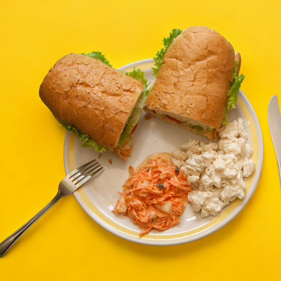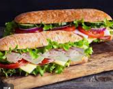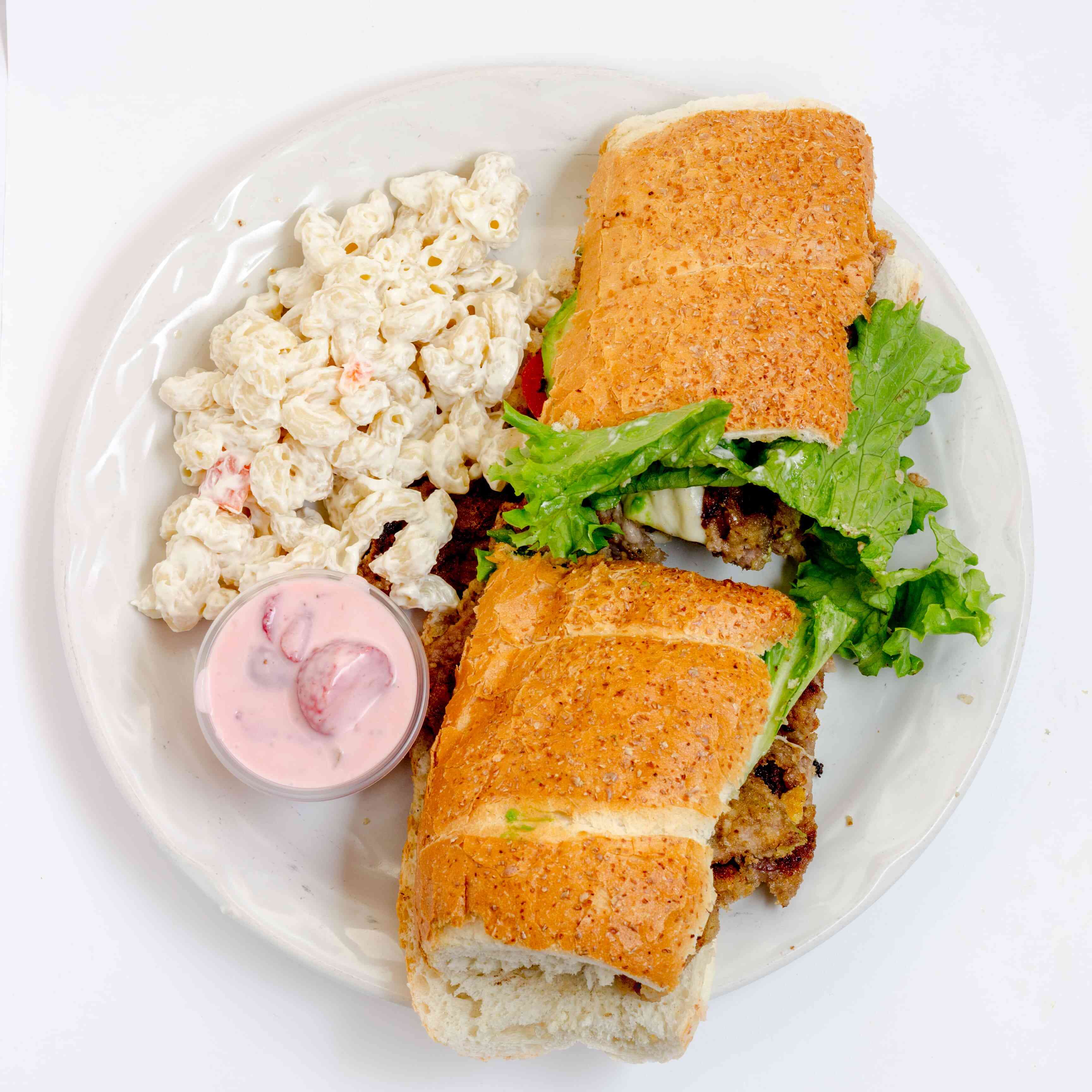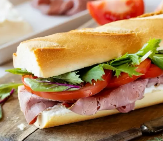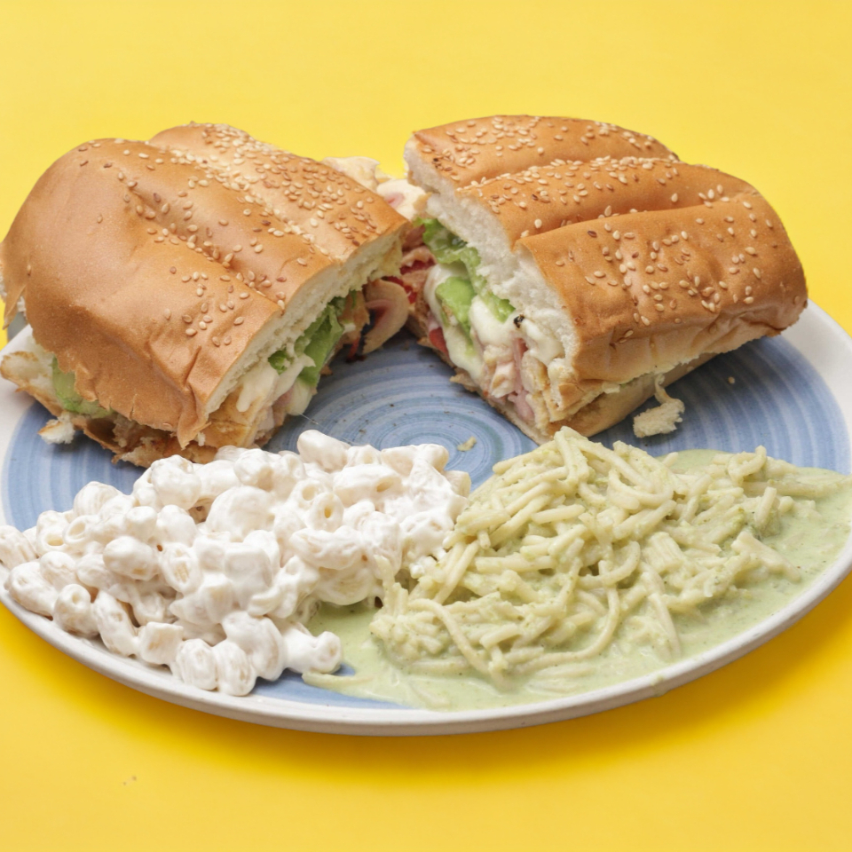Pan baguette mayonesa, jitomate, aguacate, lechuga, queso panela y jamón de pavo o pierna. Con dos guarniciones a escoger.