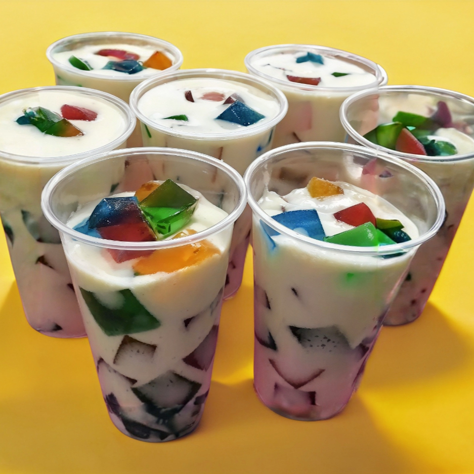 Gelatina de colores con crema y lechera.