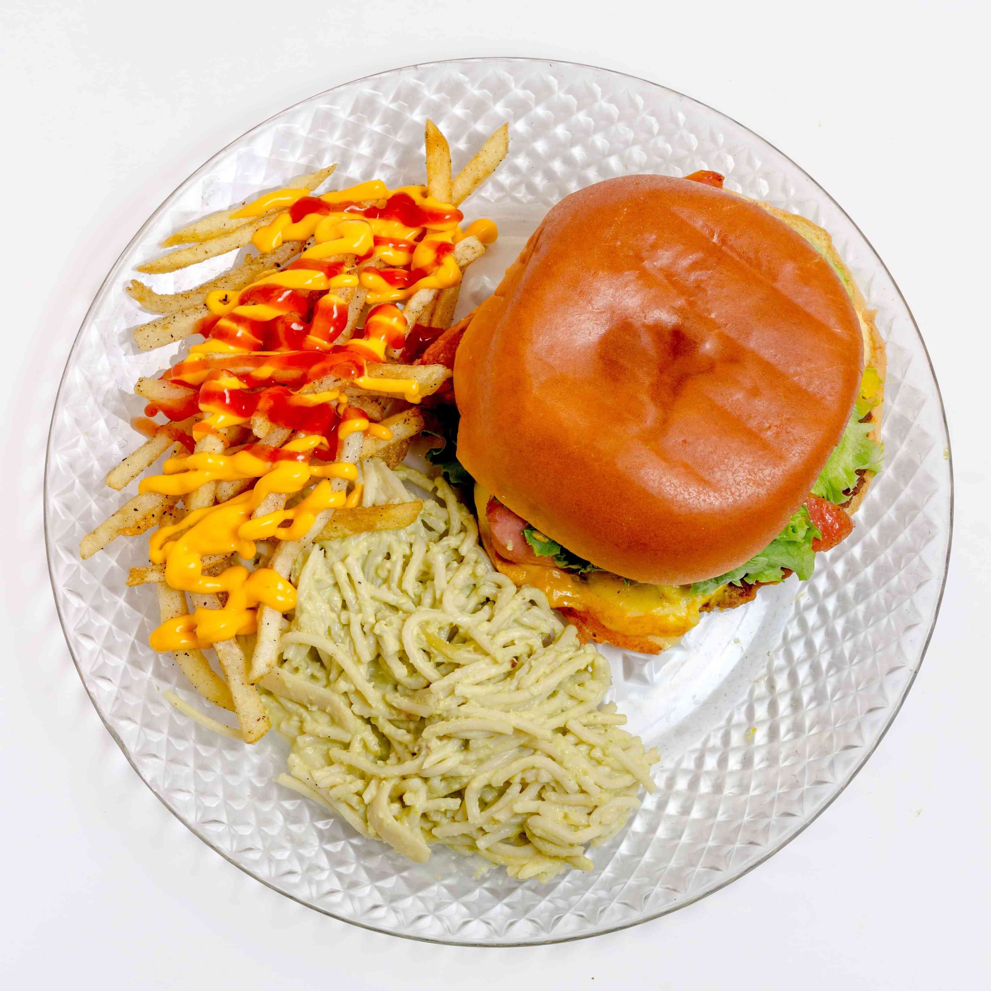 De res o pollo, piña con tocino, jitomate, lechuga, cátsup, mayonesa, queso amarillo con 2 guarniciones a escoger.