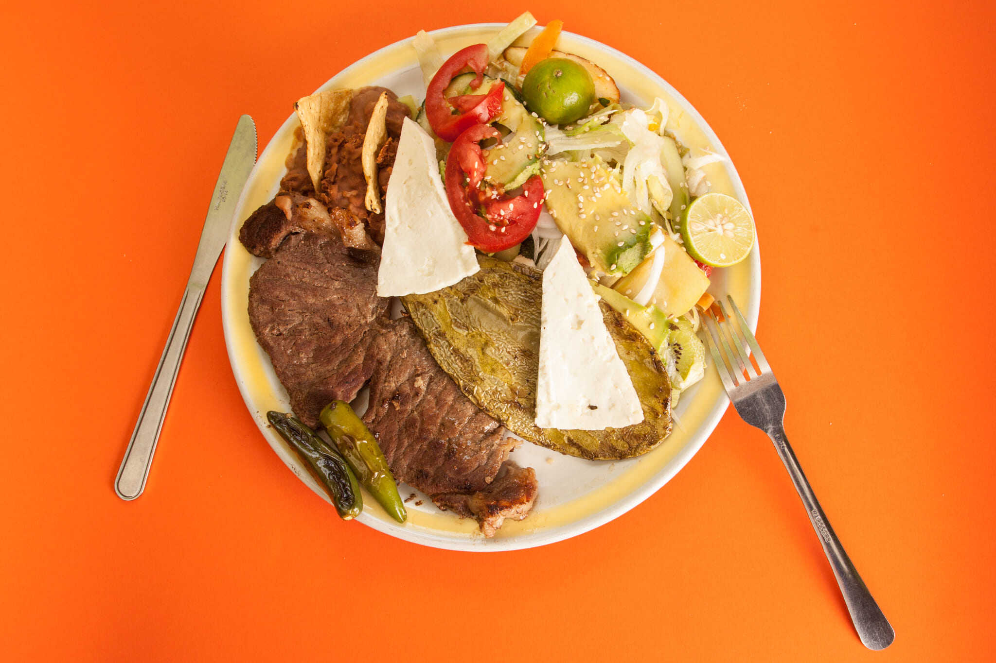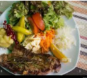 Acompañado con ensalada de vegetales, jitomate, aguacate, cebolla frita con chile morrón, nopales y frijoles. Con guarniciones a escoger.