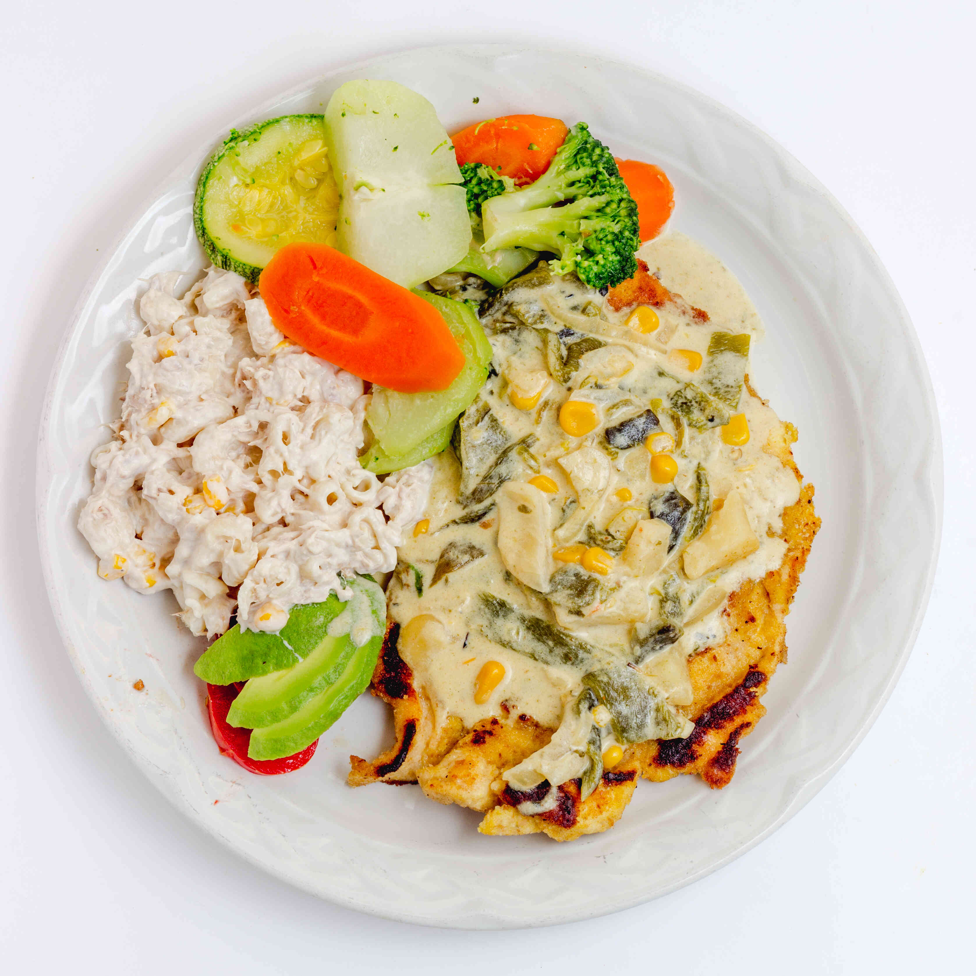 Cúbrelo con crema a escoger. Acompañado con verduras al vapor gratinadas y dos guarniciones a escoger.
