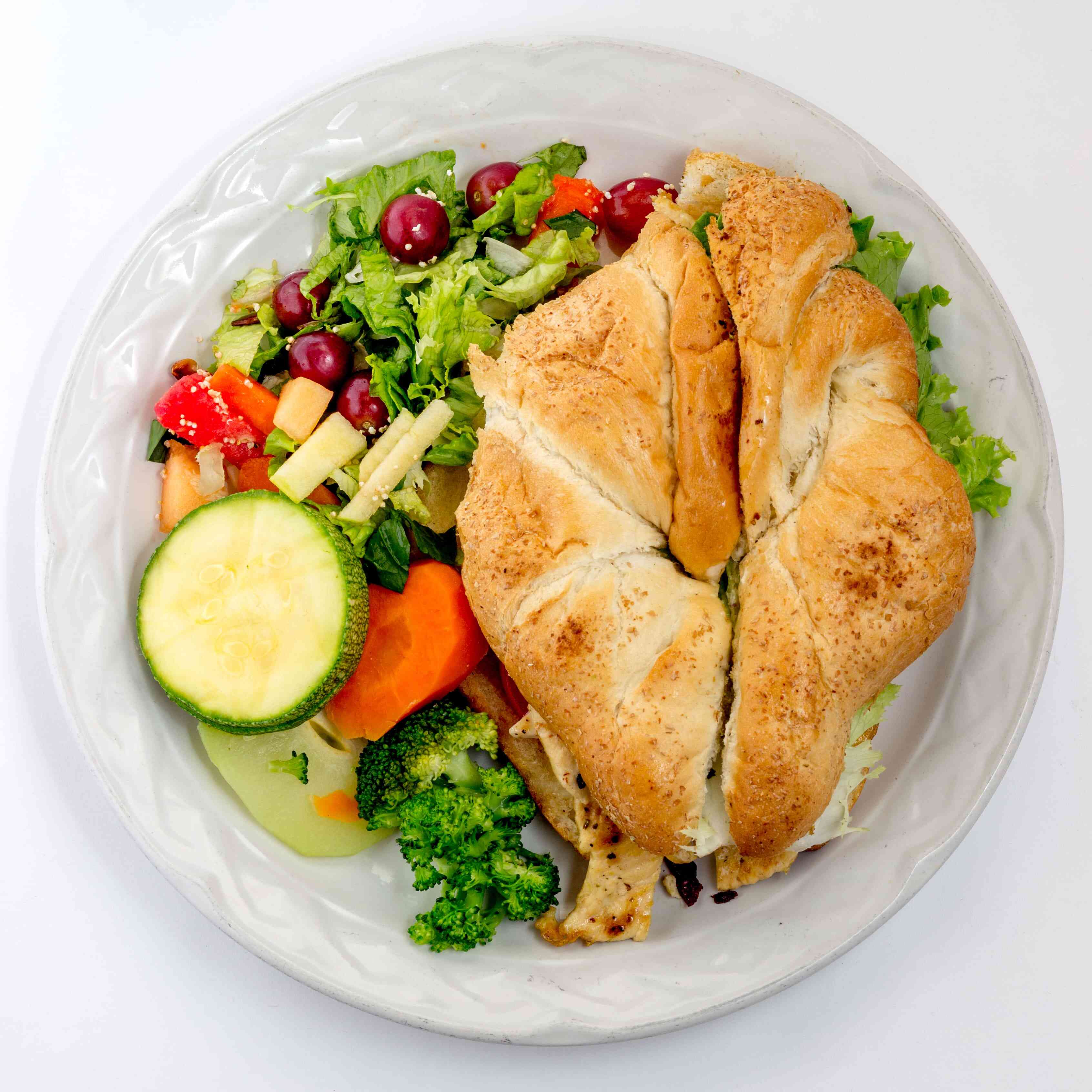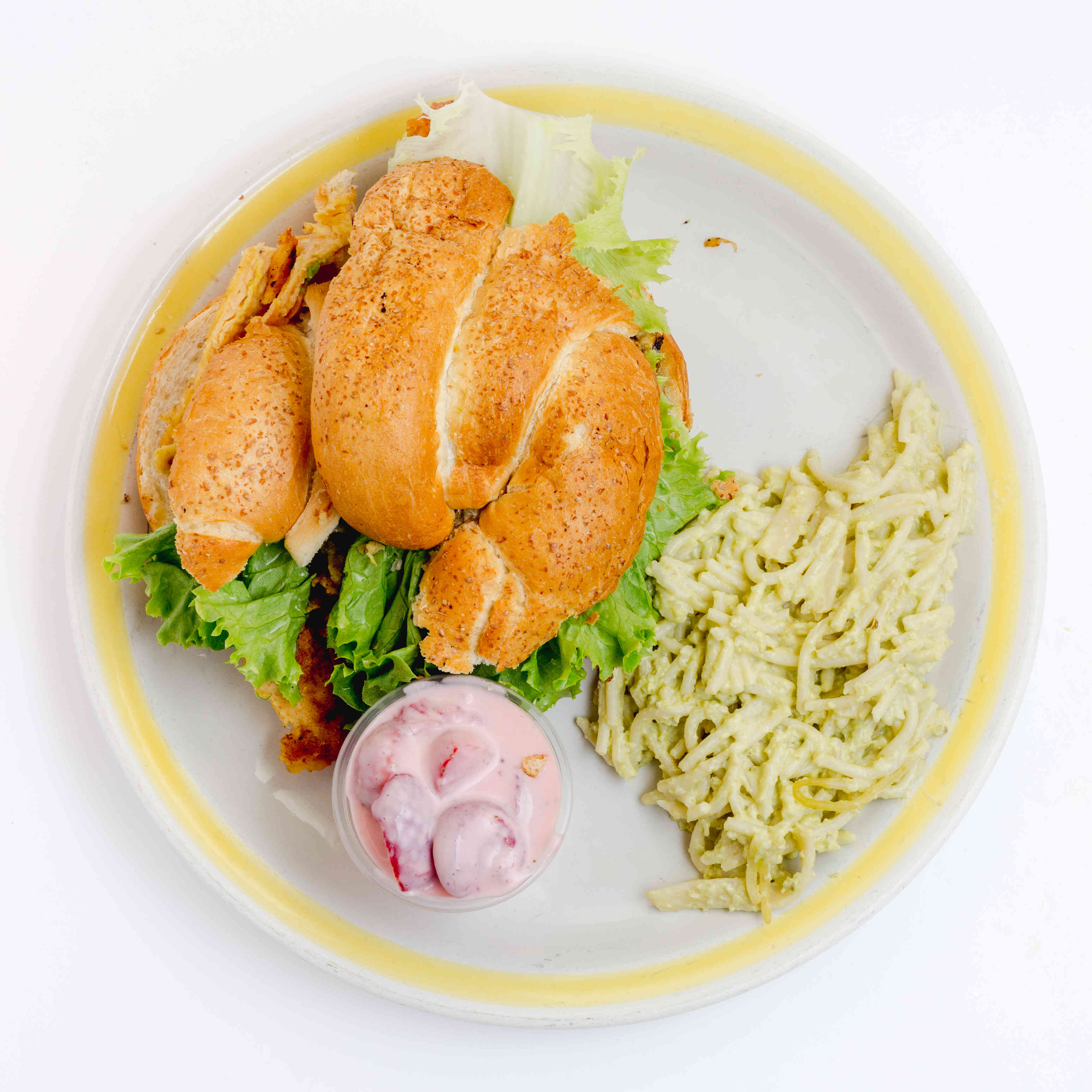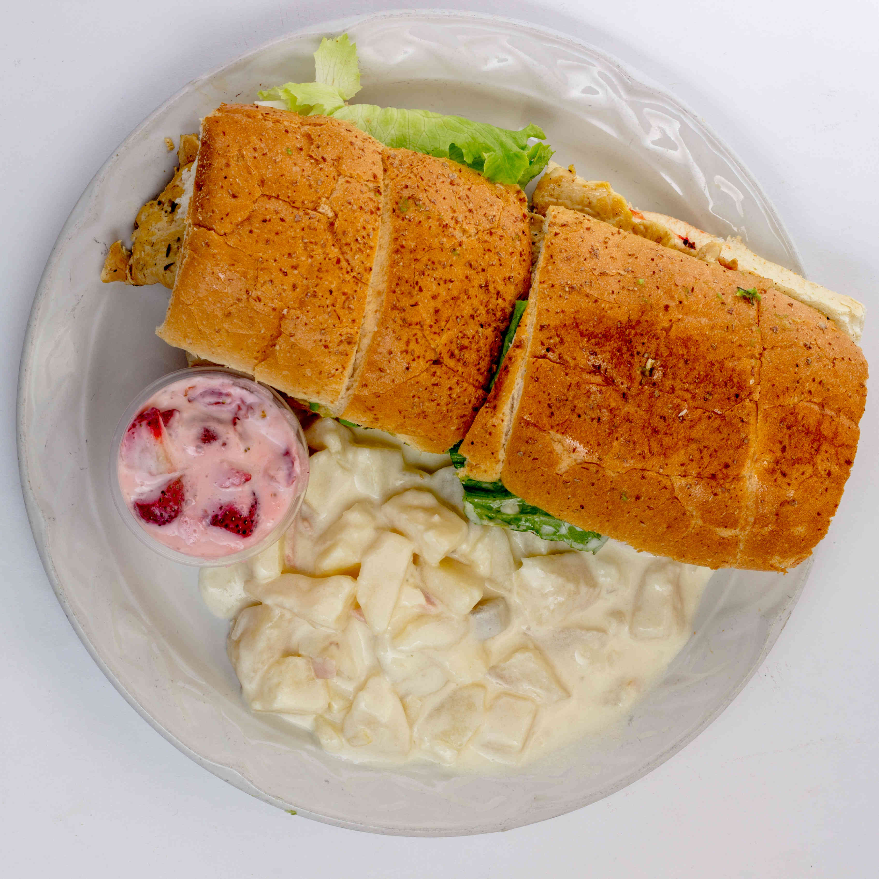 Pan de más de 15 cm de diámetro con mayonesa, jitomate, lechuga, pollo. Con dos guarniciones a escoger.