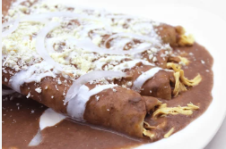 4 Enfrijoladas rellenas de pollo con queso crema, cebolla y queso, incluyen fruta, café y pan.