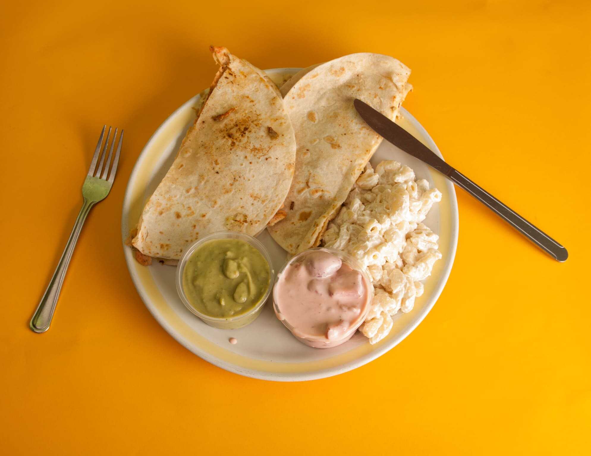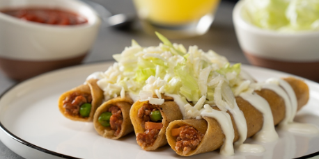 4 Tacos dorados queso, crema, lechuga y guacamole, incluye fruta, café y pan.