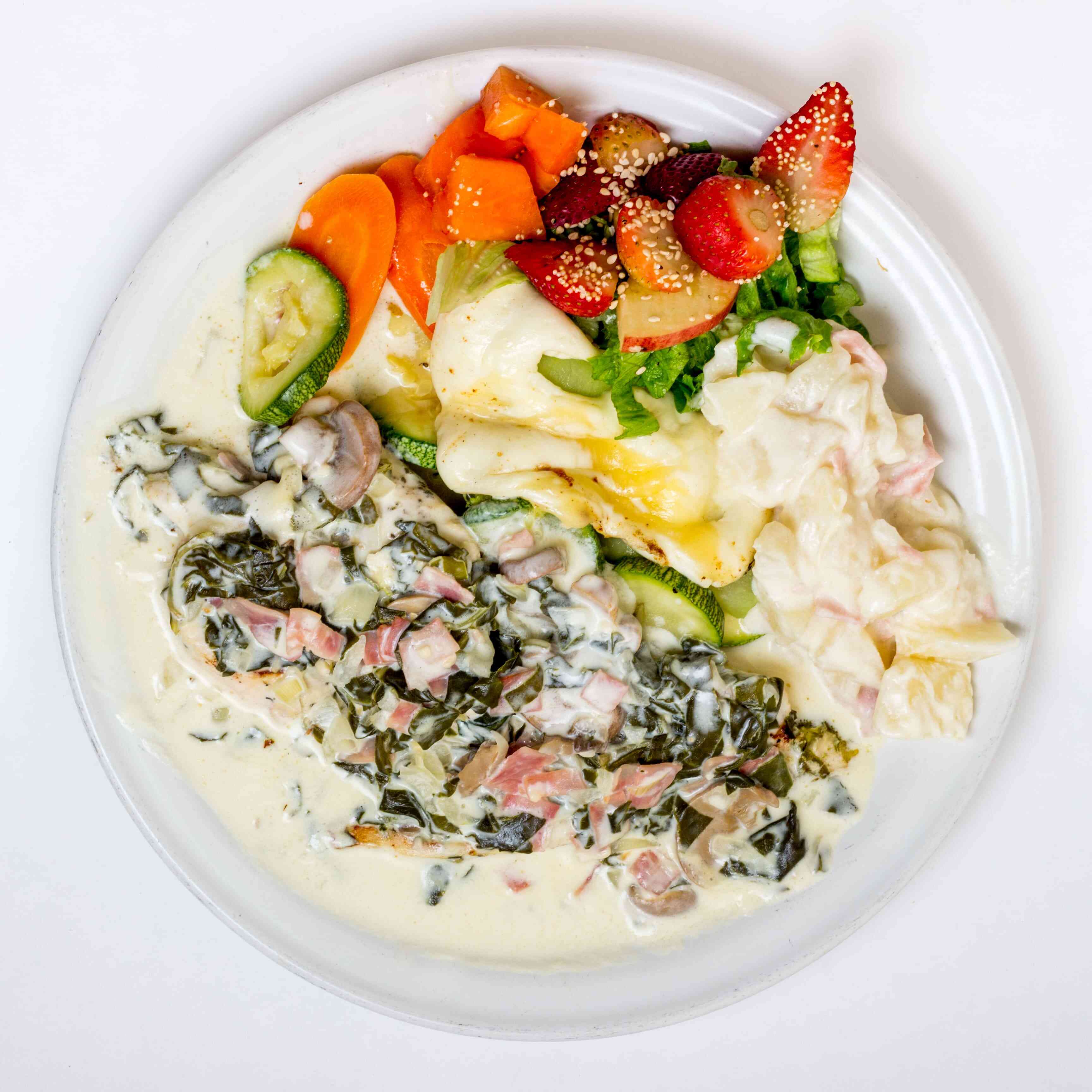 Pechuga de pollo rellena de espinacas, queso oaxaca y jamón de pavo. Cubierta con crema a elegir.Acompañada de verduras al vapor gratinada y con dos guarniciones a escoger.