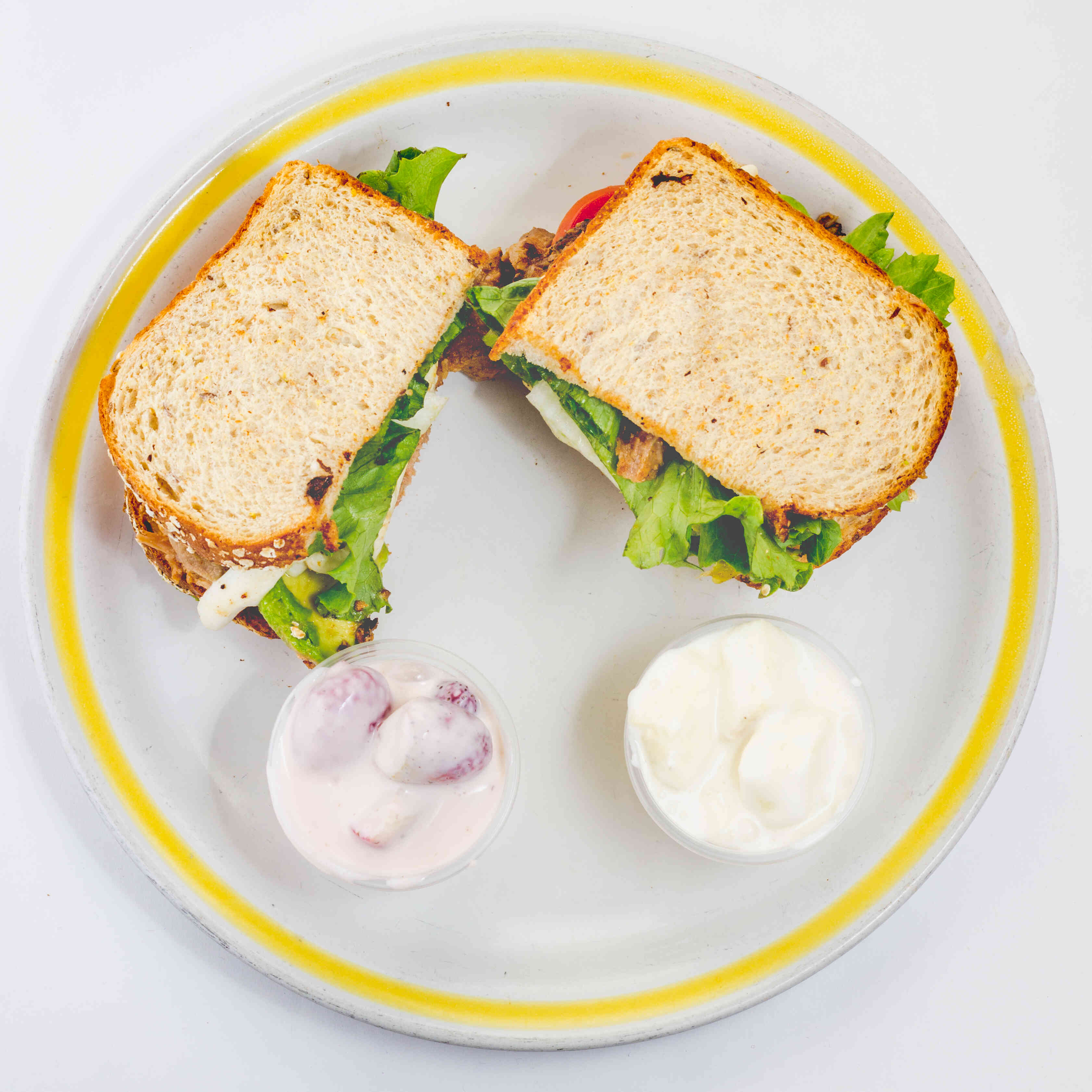 Pan integral con mayonesa, jitomate, cebolla, aguacate. Elige tu proteína y guarniciones.