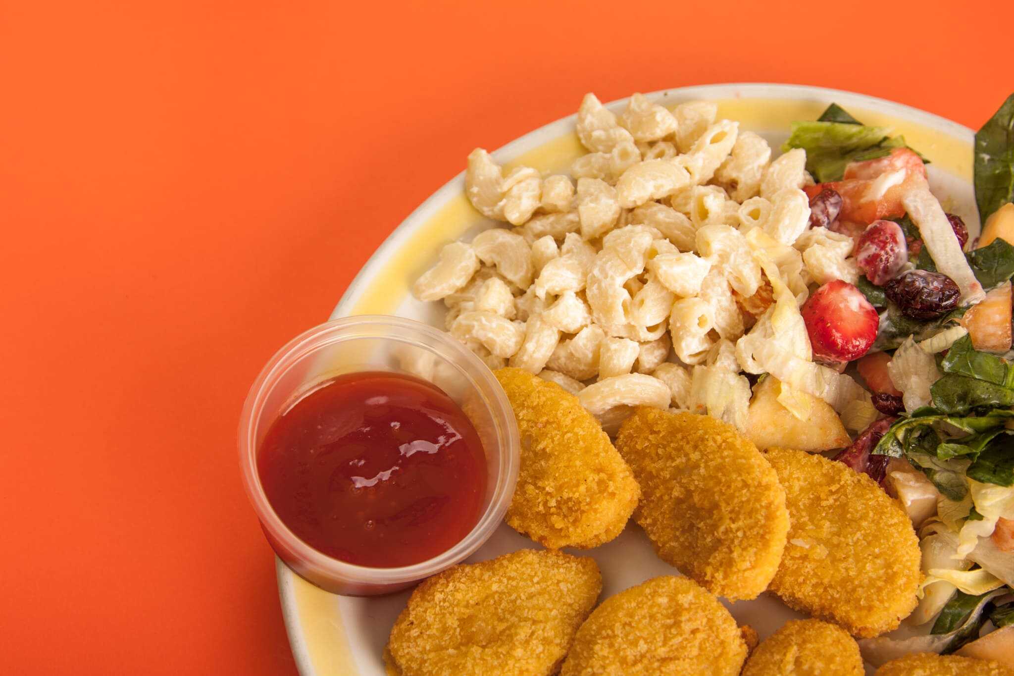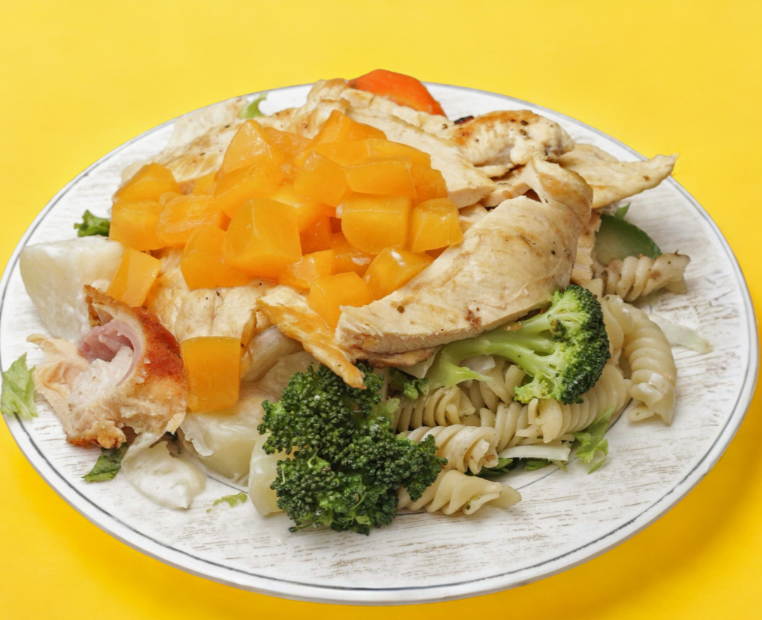 Cubierta, además de nuestra pechuga rellena, de riquísimos duraznos en almíbar o mango 100% natural. Base de: lechuga, sopa de codito, ensalada rusa, verduras al vapor, spaghetti verde, rojo o blanco.