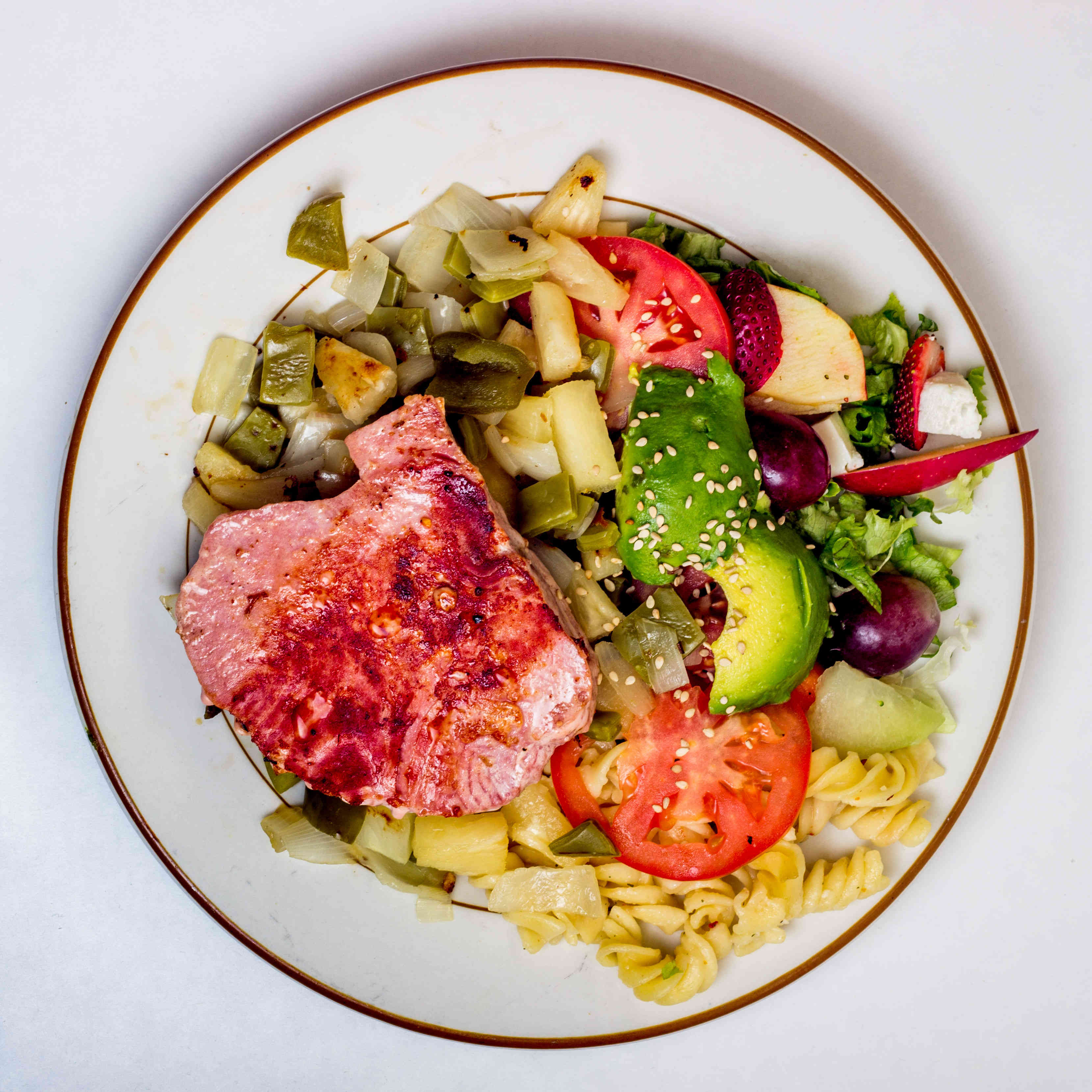 Acompañado con ensalada de lechuga y frutas. Cebolla, jitomate y aguacate. Rematada con medallas de atún fresco y dos guarniciones a escoger.