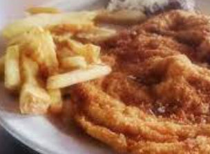 Pechuga empanizada, rellena, bistec o milanesa con frijoles y papas a la francesa. Incluye fruta, café y pan.