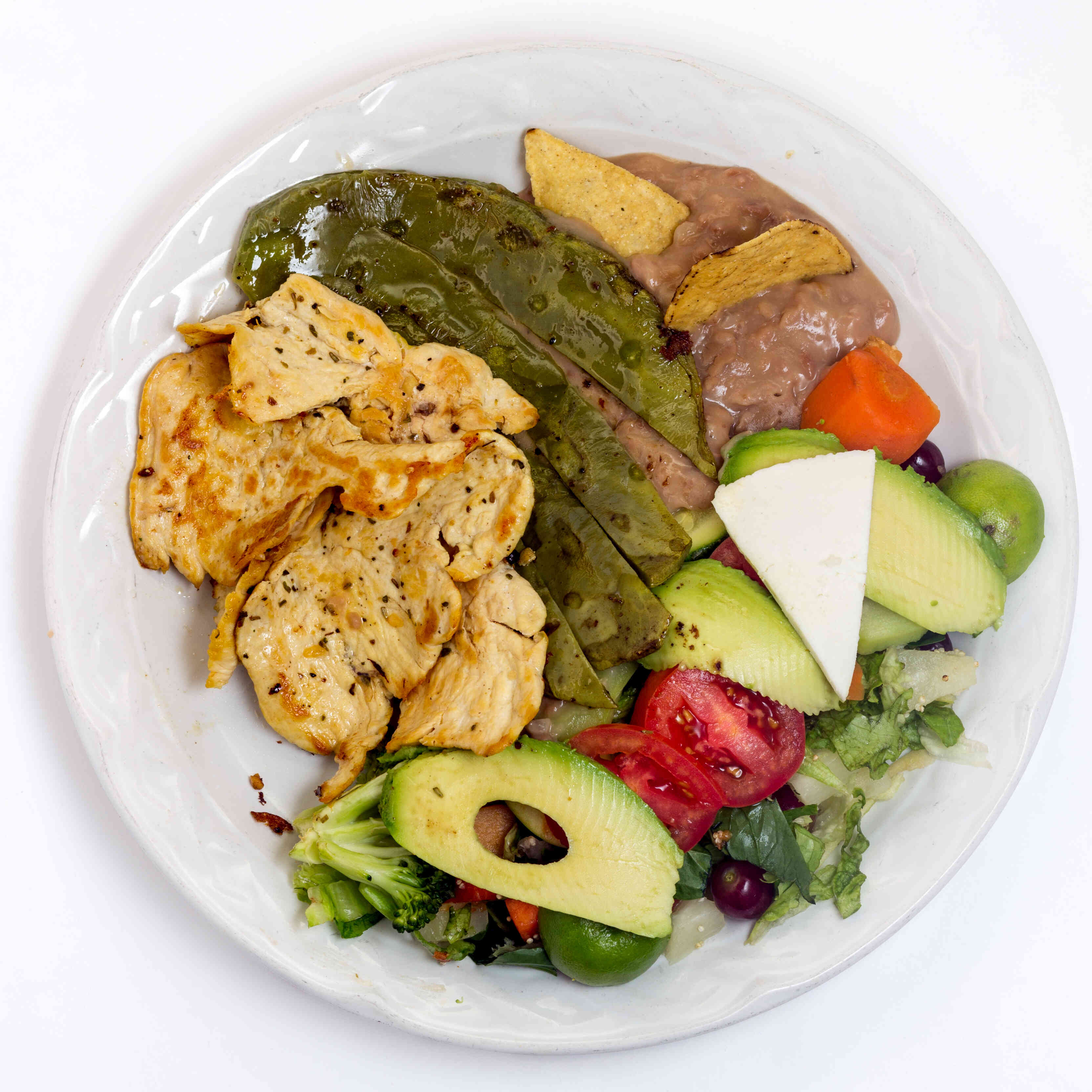 Base de lechuga con espinacas, cebolla, rico queso panela, pechuga asada o rellena, jitomate y aguacate.