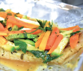 Filete empapelado con jitomate, cebolla, champiñones, granos de elote, epazote y chile jalapeño. Cubierto con crema a escoger. Acompañado de verduras al vapor gratinadas. Con guarniciones a elegir.