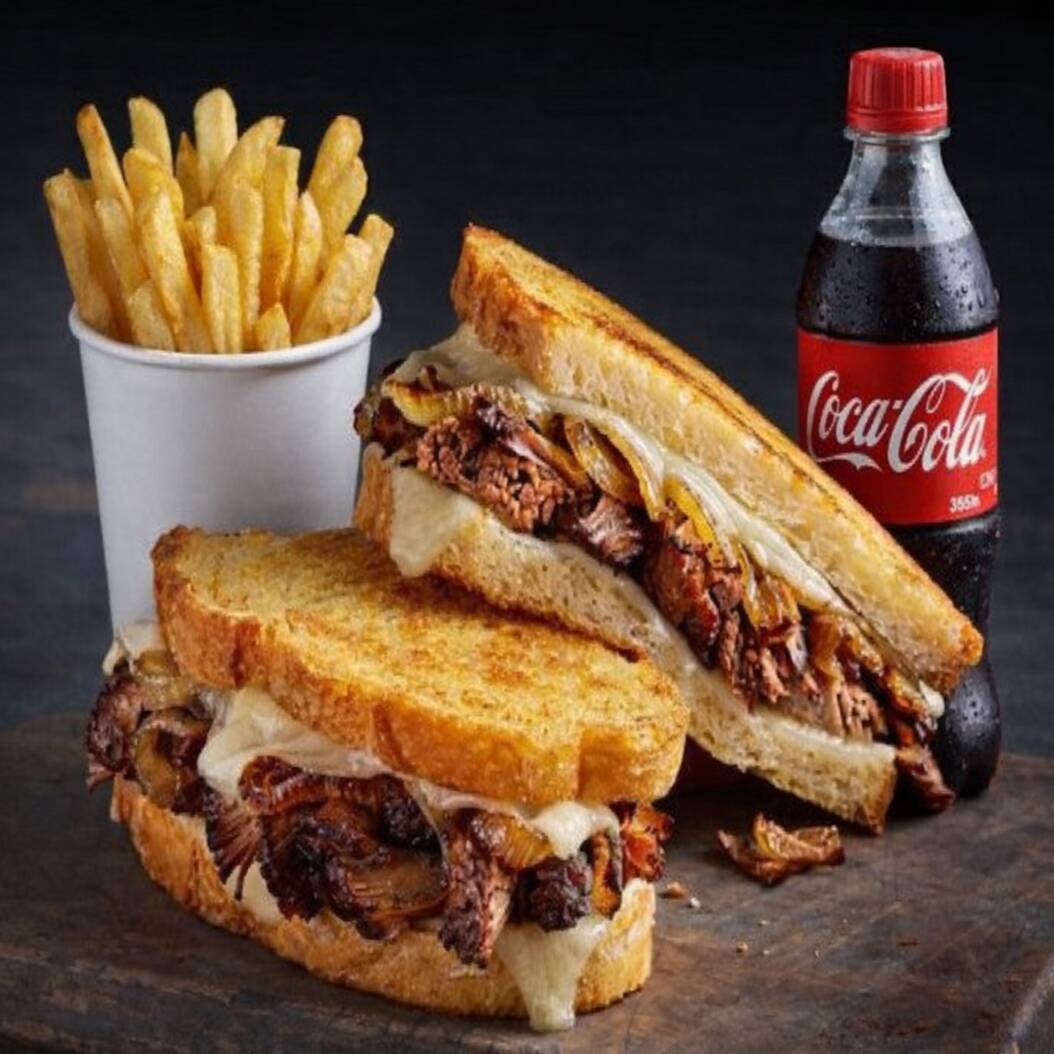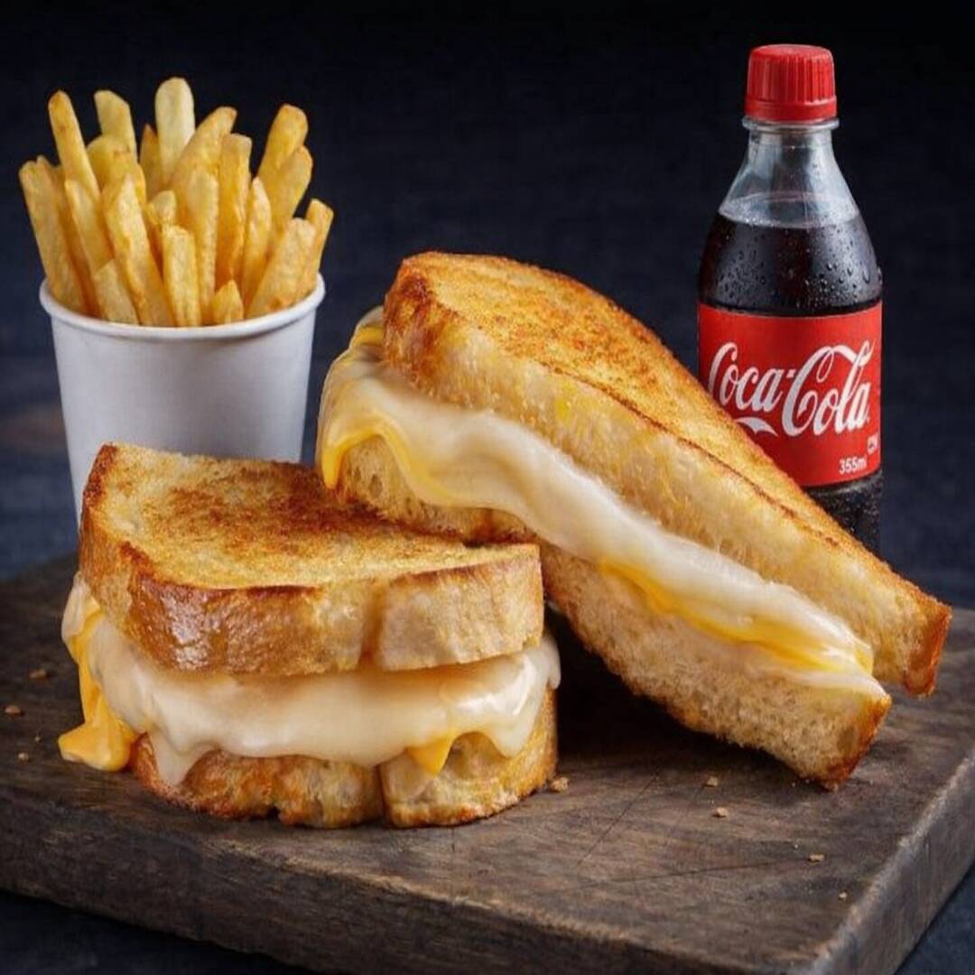 Sandwich 4 Quesos con Papas y Refresco