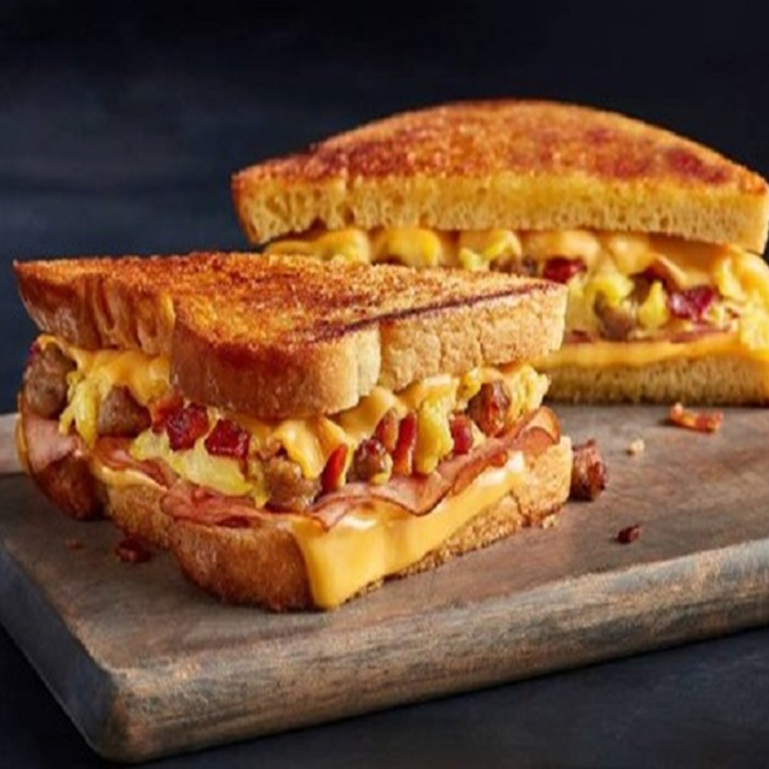 Queso Amarillo, queso Philadelphia, queso manchego y tocino, mayonesa chipotle en pan oroweat.