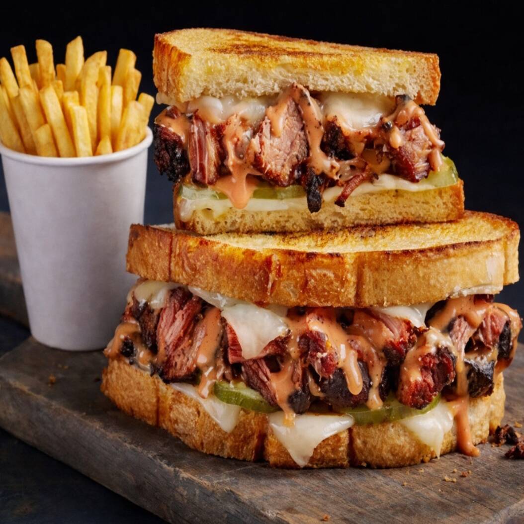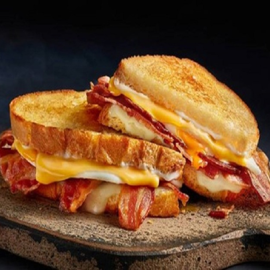 Queso Amarillo, queso Philadelphia, queso manchego y tocino, mayonesa chipotle en pan oroweat.
