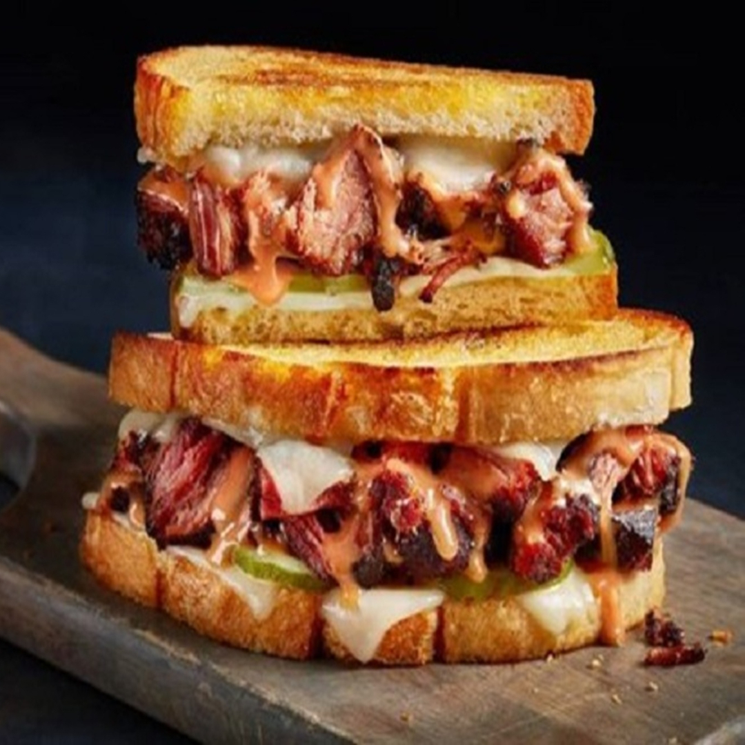 Arrachera con cebolla caramelizada, queso manchego, mayonesa chipotle en pan oroweat.
