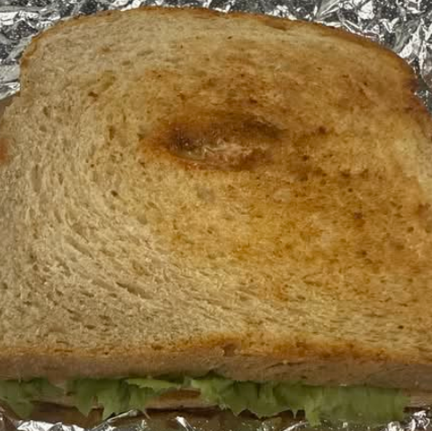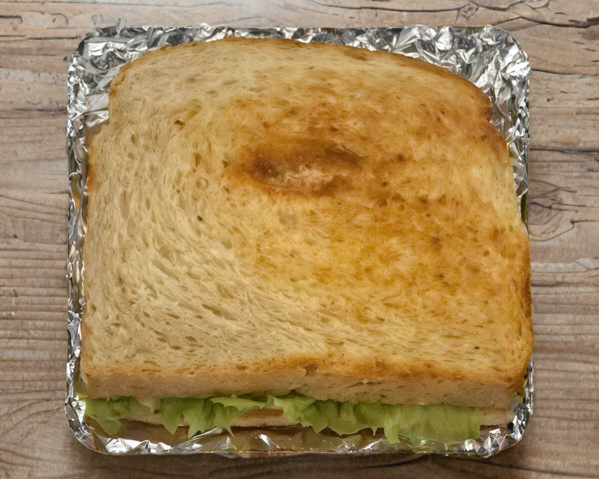 Pan de caja artesanal gigante, atún, queso gouda, mayonesa, jitomate, aguacate, picante y lechuga.