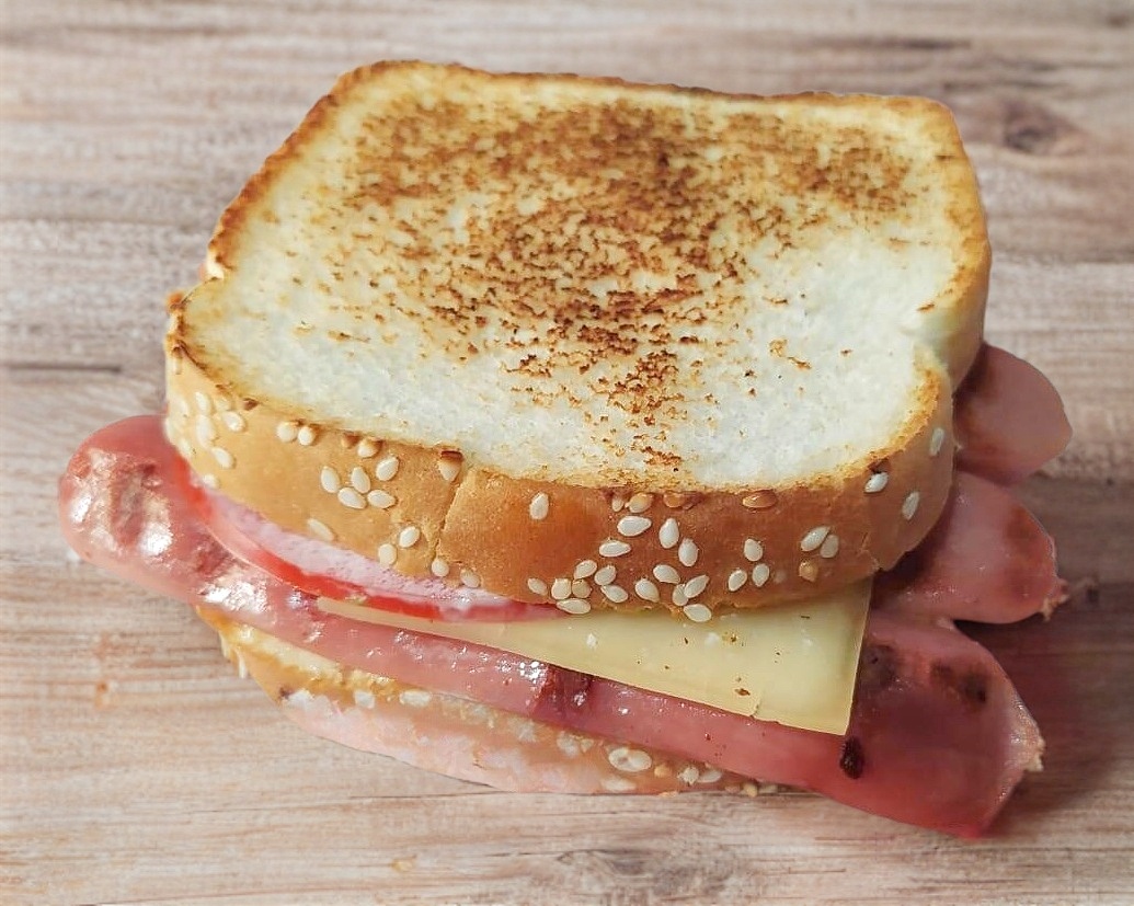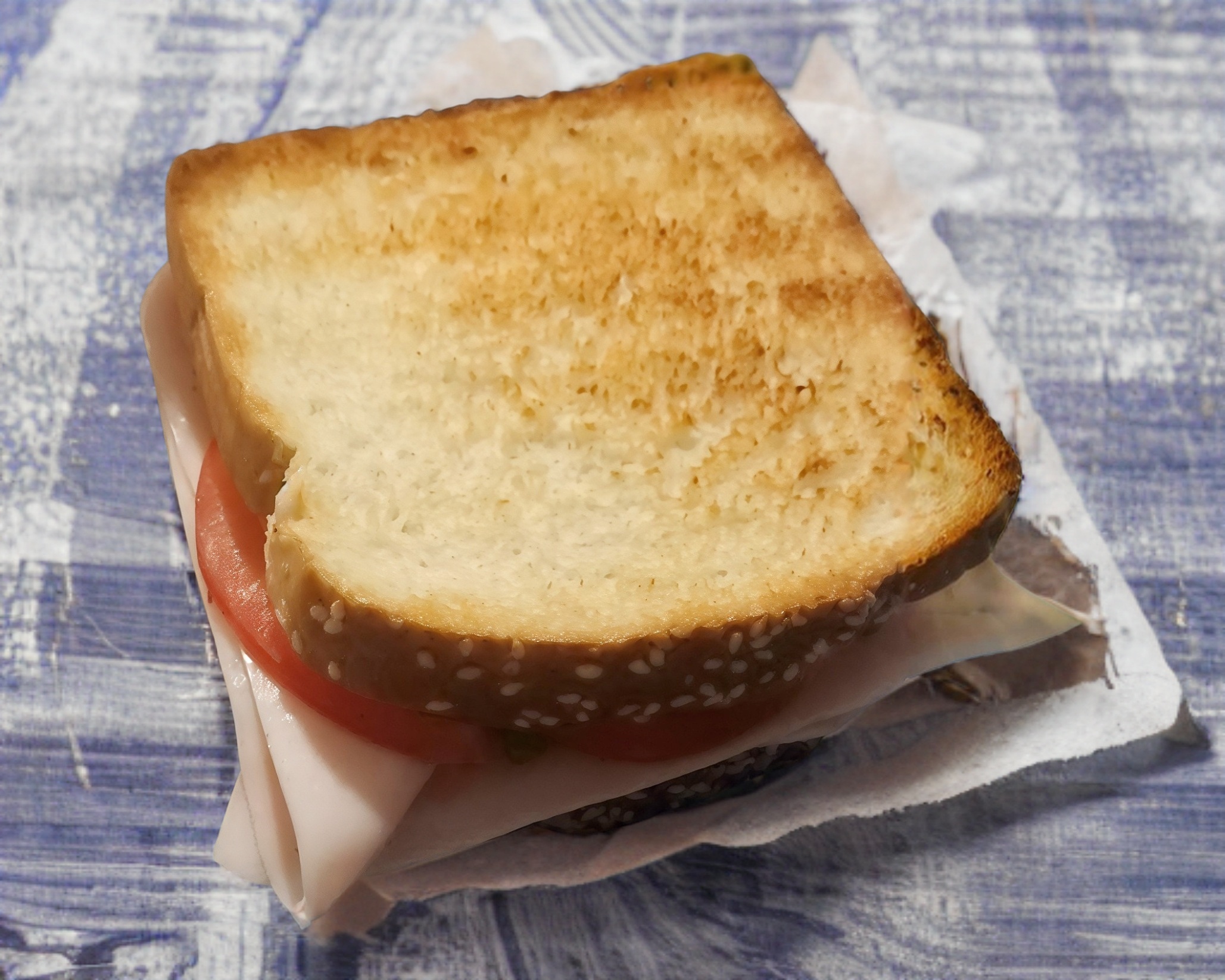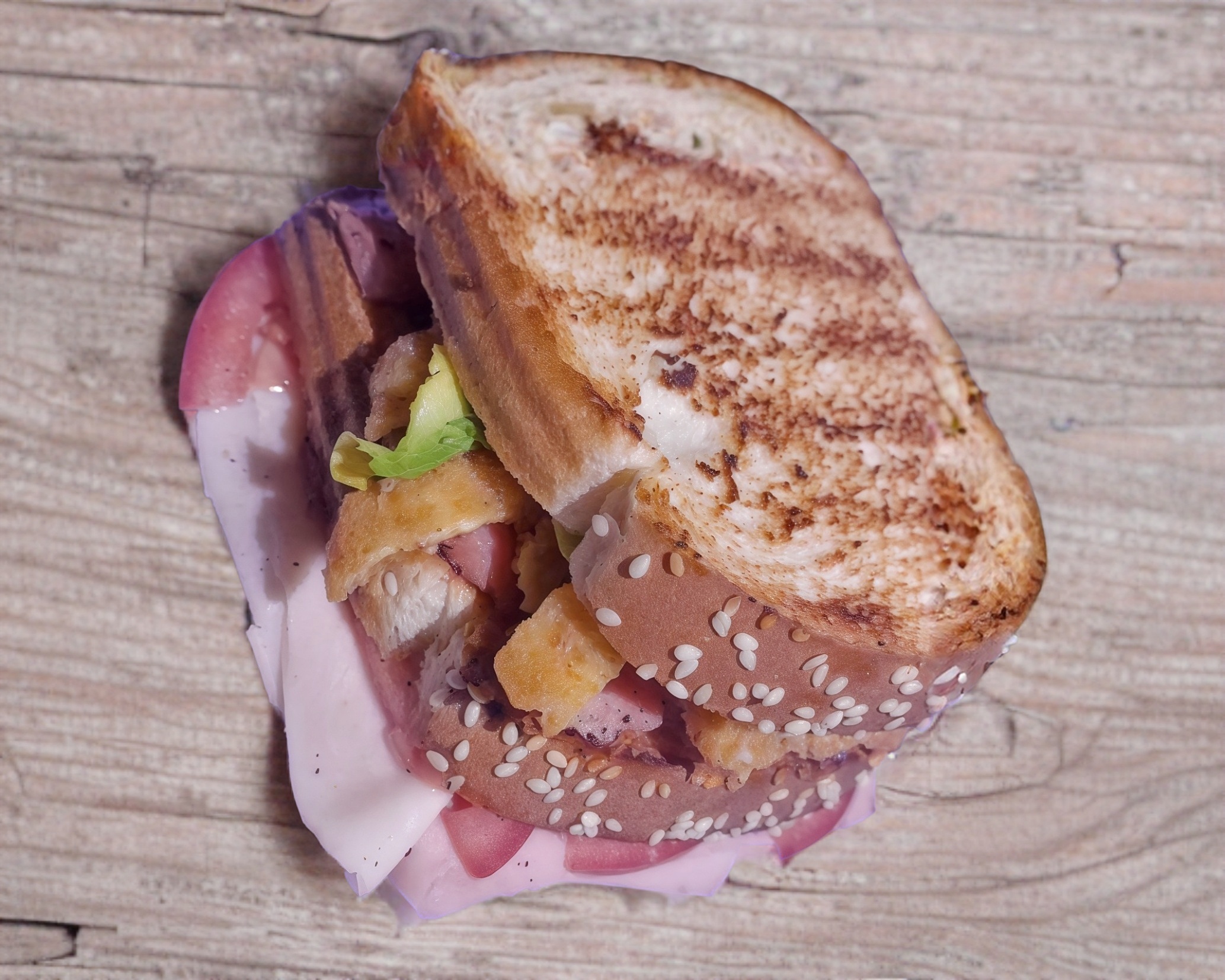 3 Panes, mayonesa, pechuga de pavo, jamón de pavo, salchicha, pechuga empanisada , jitomate, aguacate, manchego y panela picante al gusto .
