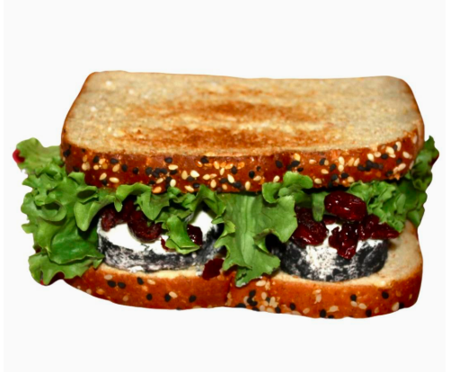 Queso de cabra (hierbas finas/ajonjolí/nuez/ceniza/chipotle) en pan multigrano tostado con lechuga, arándanos deshidratados, zanahoria, pepino y manzana gala. Picante opcional: jalapeños en rajas y aderezo de chipotle.
