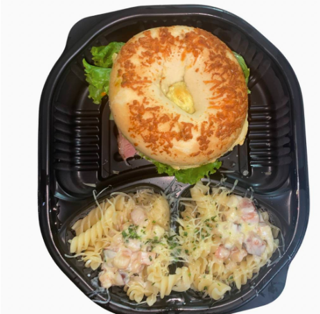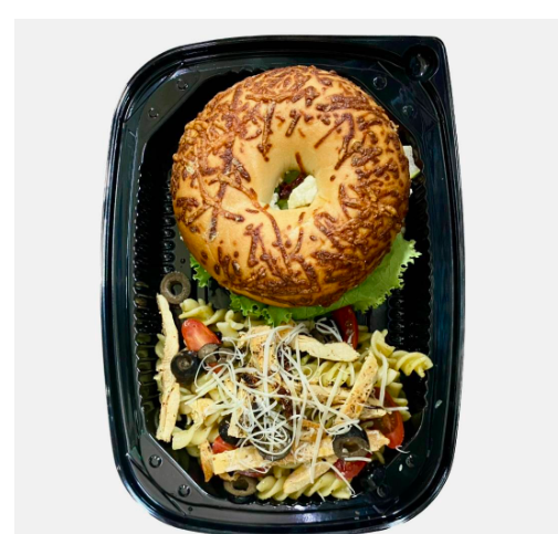 Media porción de pasta con pesto (de albahaca y nueces), pechuga de pollo asada, aceitunas negras, tomates cherry, tomates deshidratados y parmesano. Acompáñala con el sándwich, bagel o 1/2 porción de ensalada de tu elección.