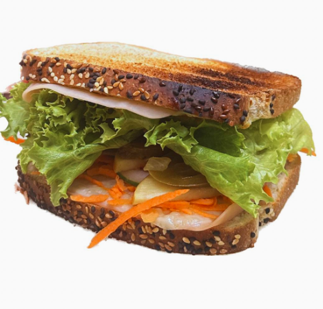 Jamón de pechuga de pavo con queso gouda, manchego y panela gratinados sobre pan multigrano tostado. Acompañado de lechuga, zanahoria, pepino y manzana. Picante opcional: jalapeños en rajas y aderezo de chipotle.