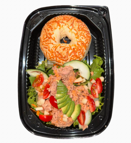 70 g de atún Marina Azul en agua con sal de laguna, limón y aderezo de chipotle (sin mayonesa). Sobre cama de lechugas, tomate cherry, pepino, manzana y zanahoria. Acompáñala con el sándwich, bagel o 1/2 porción de ensalada de tu elección.