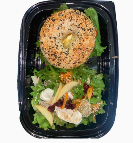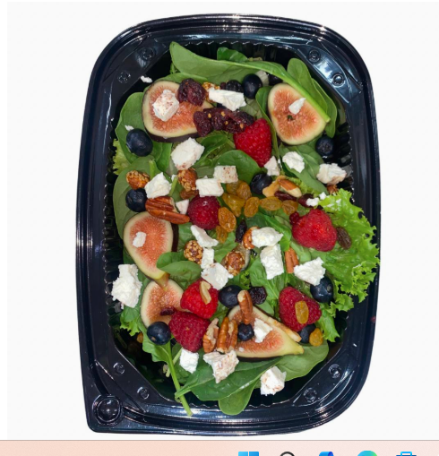 Media porción de ensalada de frutos rojos con queso de cabra, sobre base de espinacas baby orgánicas y lechugas baby. Acompáñala con el bagel, sándwich o 1/2 porción de ensalada o pasta de tu elección.