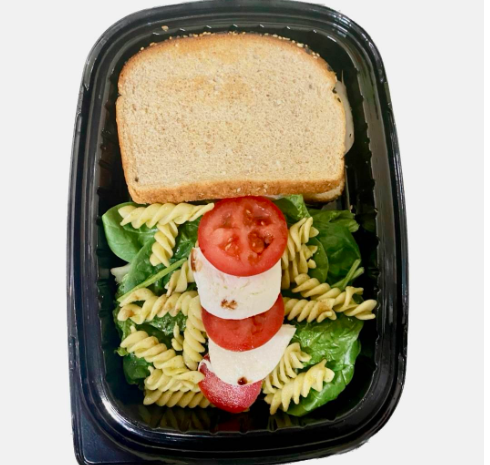 Media porción de ensalada con queso mozzarella, pasta con pesto, tomate y reducción de balsámico. Acompáñala con el sándwich, bagel o 1/2 porción de ensalada de tu elección.
