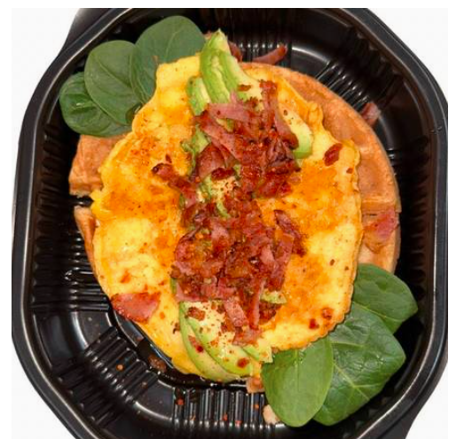 Con omelette y jamón de pechuga de pavo asado o tocino crujiente, hojuelas de chile con un toque de miel de maple y aguacate.