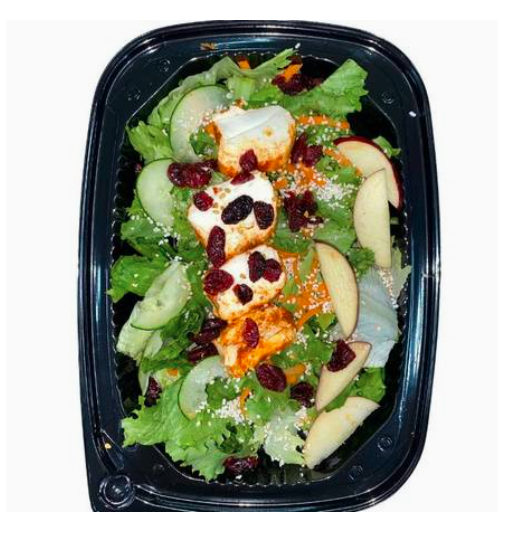 70 g de queso de cabra (hierbas finas/ajonjolí/nuez/ceniza/chipotle) con arándanos deshidratados, manzana gala, pepino, zanahoria y lechuga. Picante opcional: jalapeños en rajas y aderezo de chipotle.