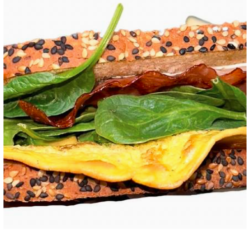 Omelette con un toque de mantequilla, jamón de pechuga de pavo o tocino crujiente. Con espinaca baby orgánica, aguacate y hojuelas de chile.