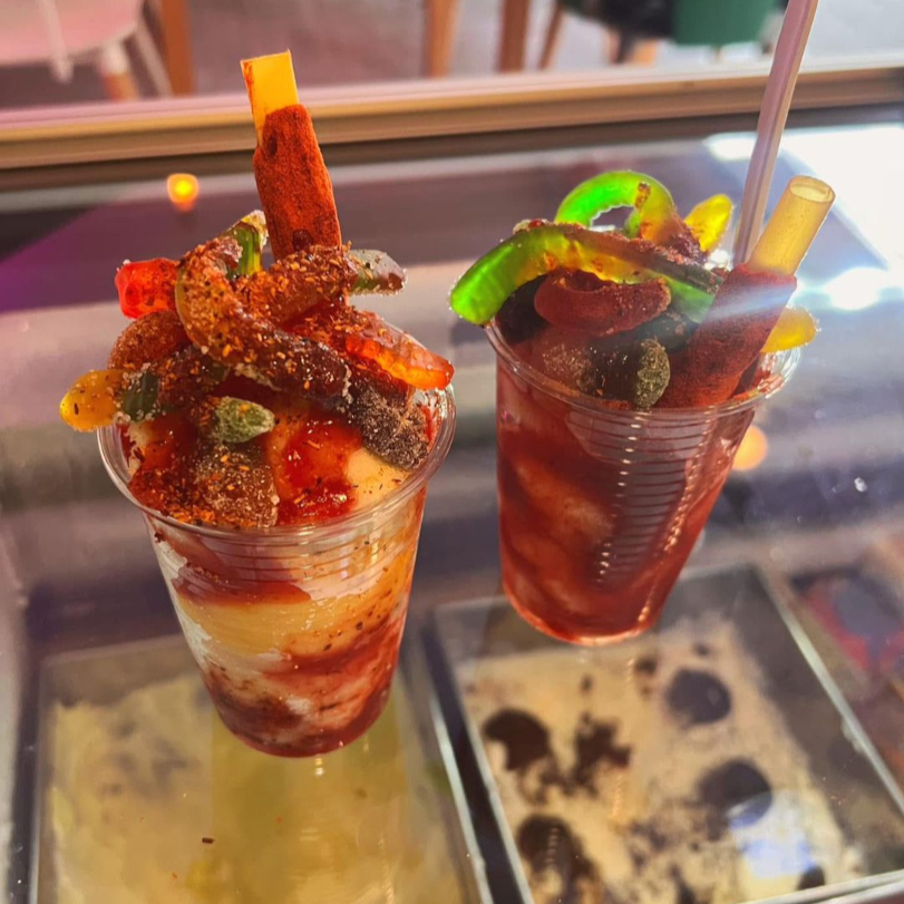 3 bolas de nieve con gomitas de frutas, gusanito, una banderilla de tamarindo, bañada con chamoy, miguelito y Tajín