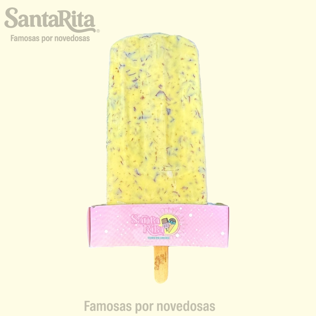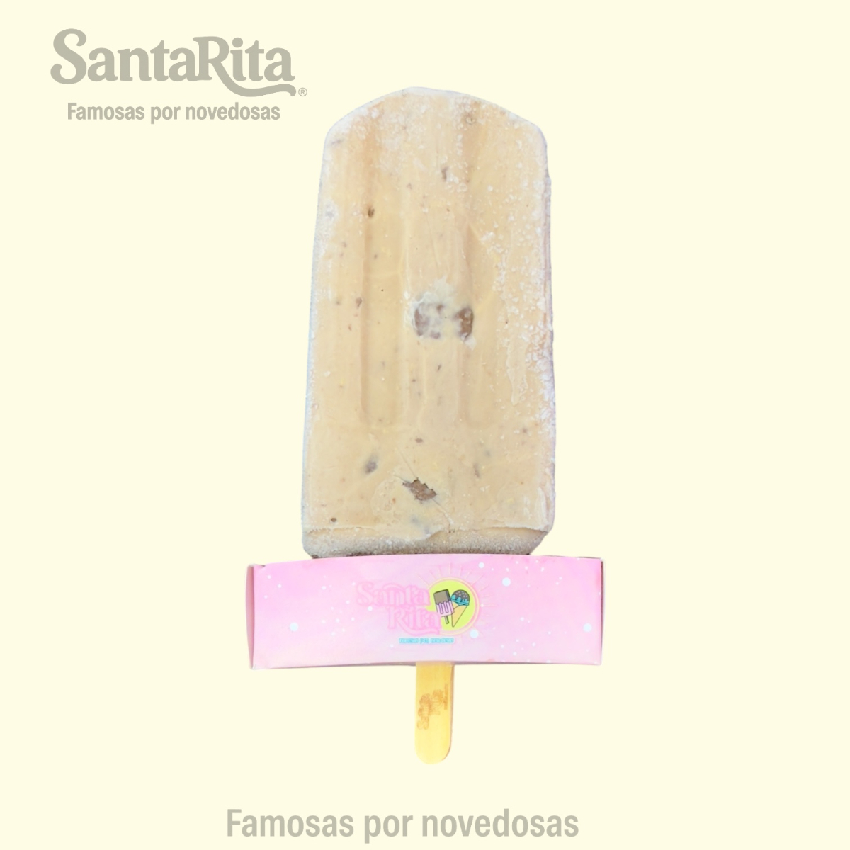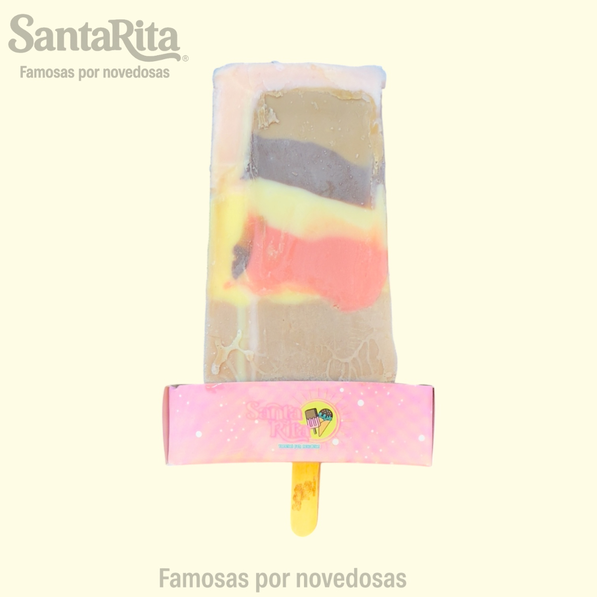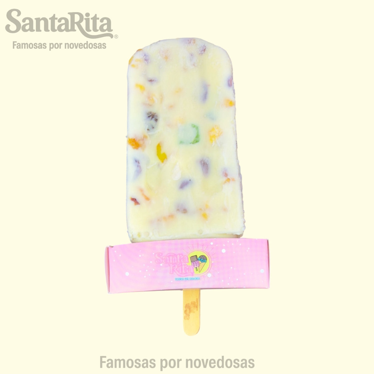 Paleta de crema elaborada con la receta especial de Santa Rita, preparada con una mezcla de frutas como papaya, kiwi, manzana, dátil y pasas. Cada mordida combina la suavidad cremosa con el sabor natural y la textura de las frutas, creando una experiencia premium, colorida y deliciosa.