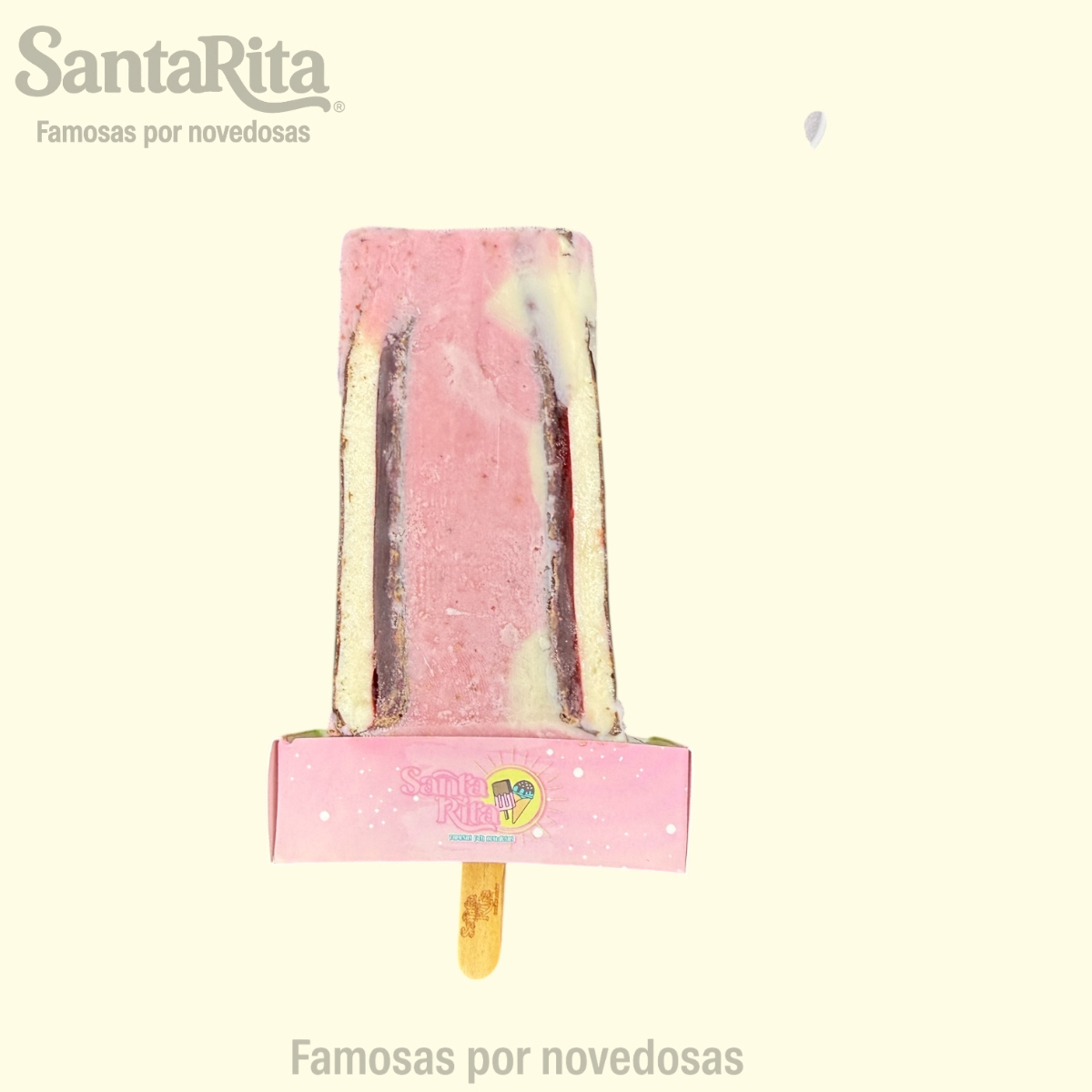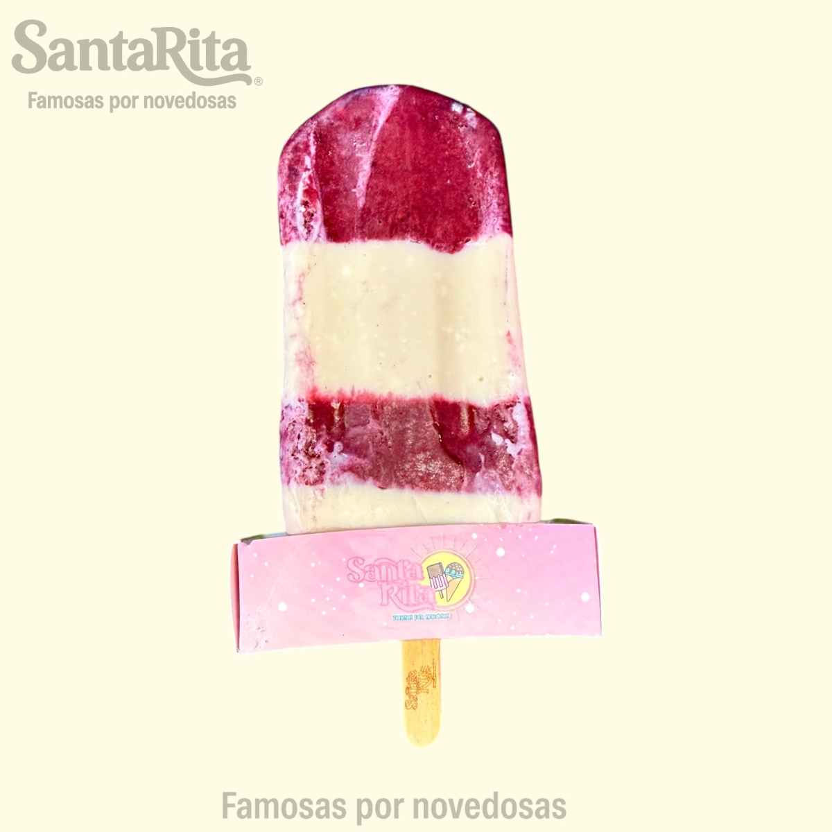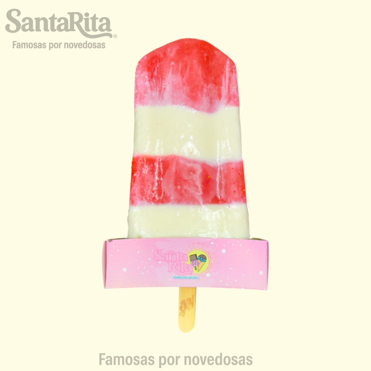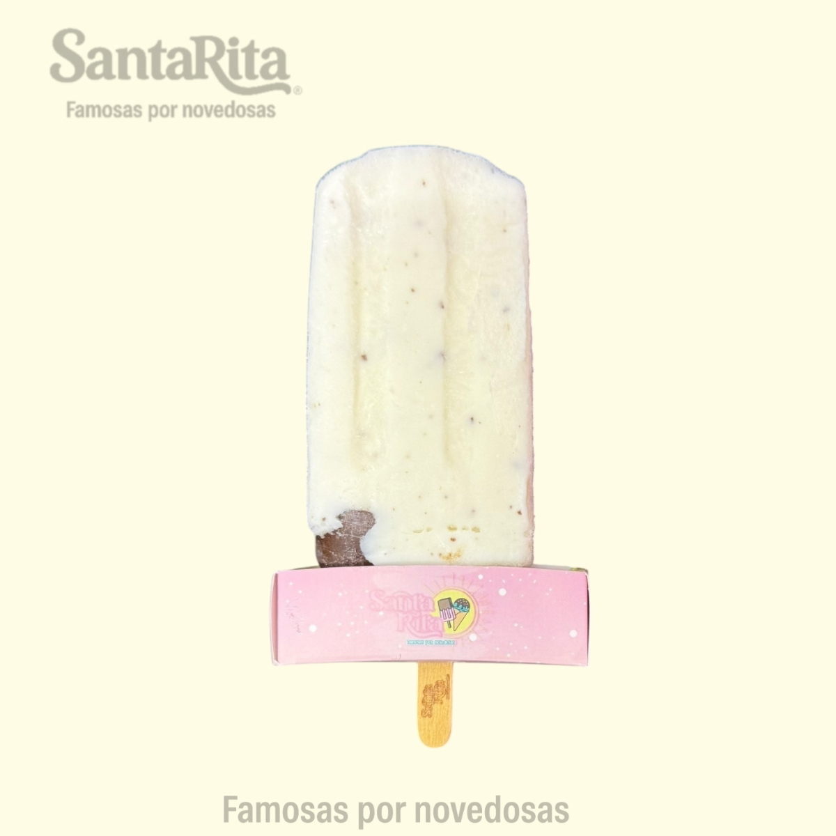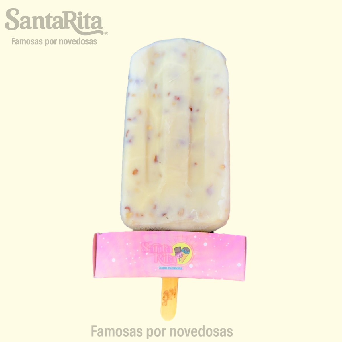 Paleta de crema elaborada con la receta especial de Santa Rita, preparada con una mezcla de frutas como papaya, kiwi, manzana, dátil y pasas. Cada mordida combina la suavidad cremosa con el sabor natural y la textura de las frutas, creando una experiencia premium, colorida y deliciosa.