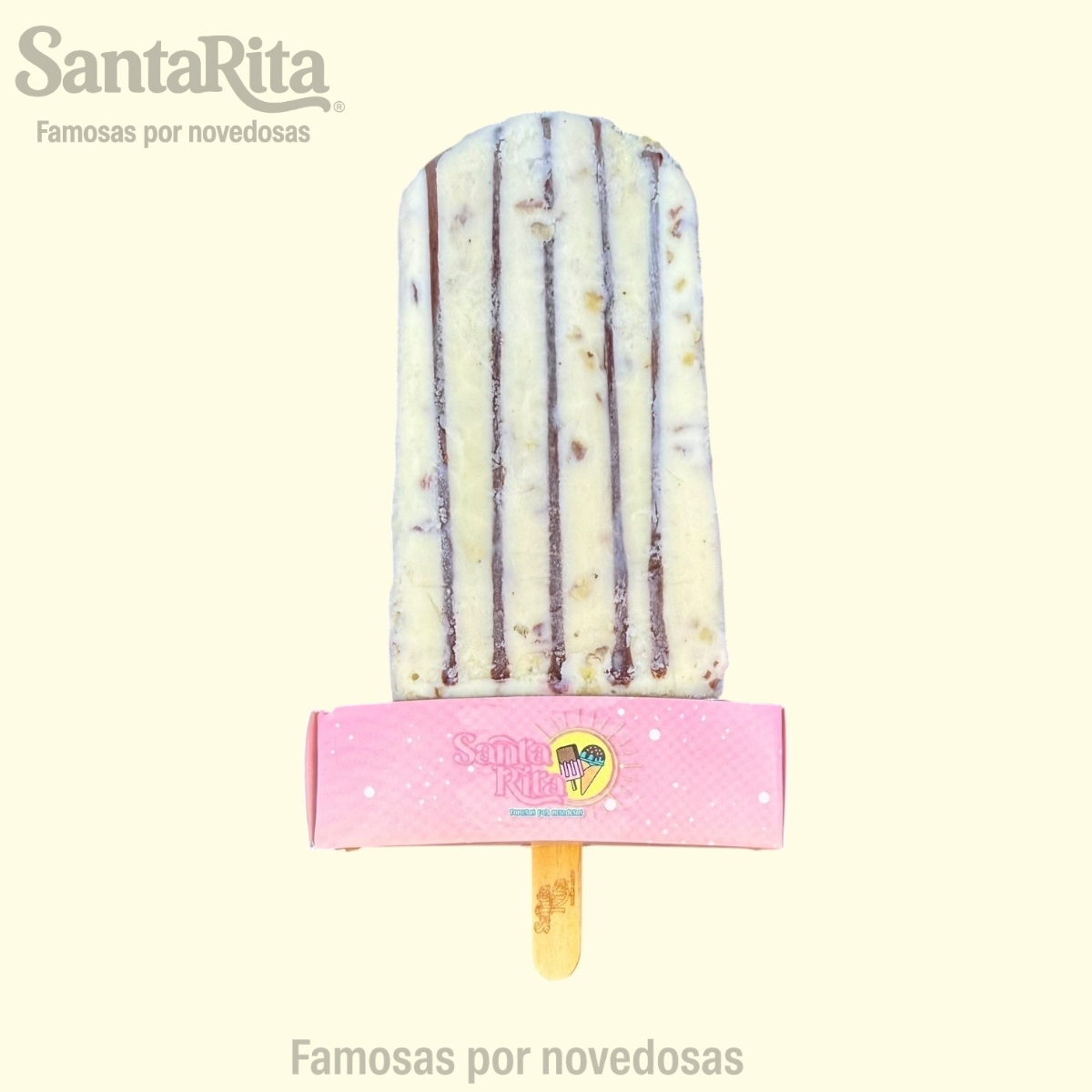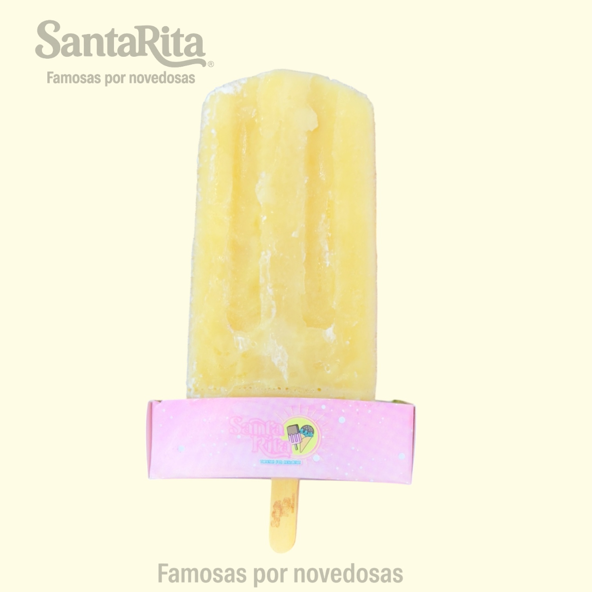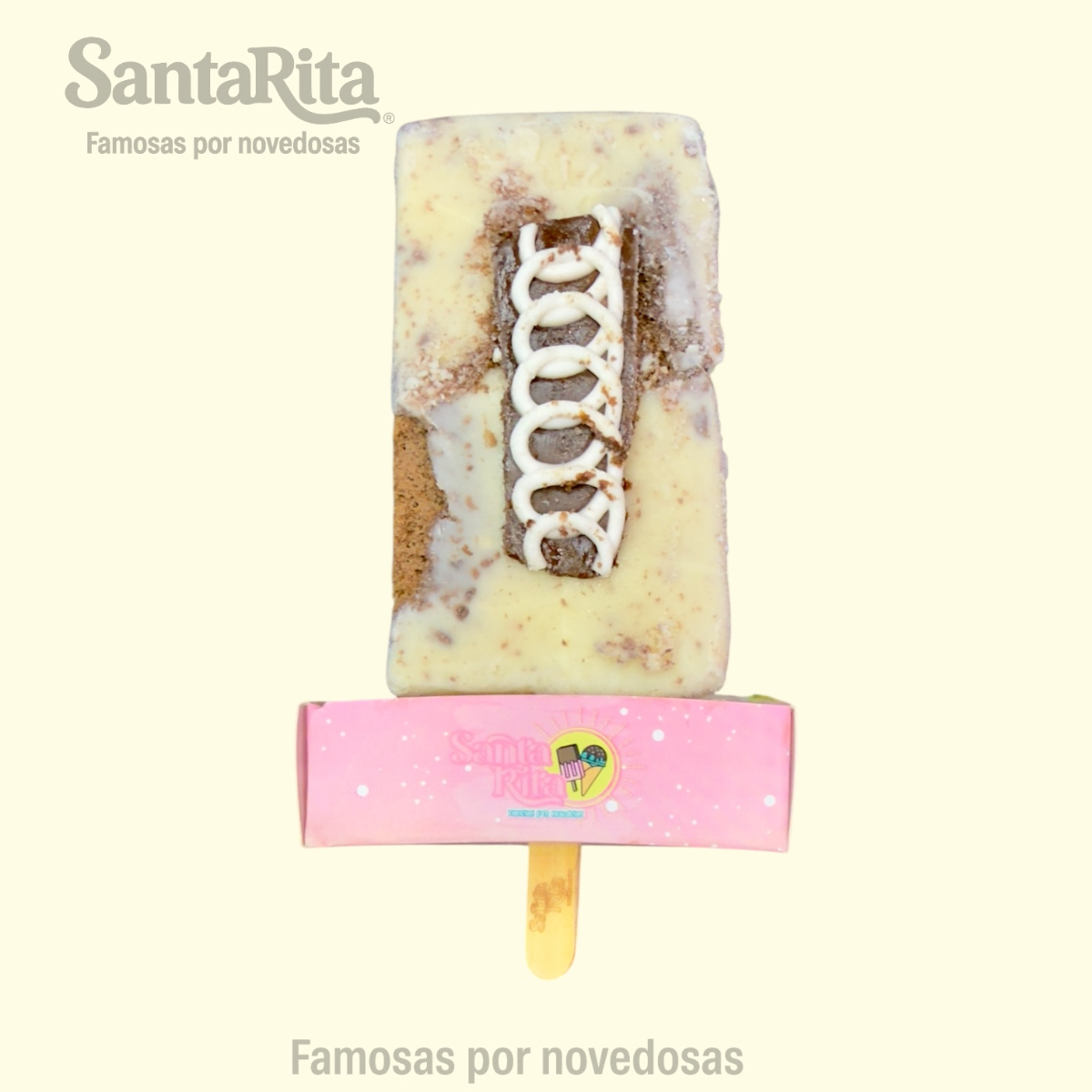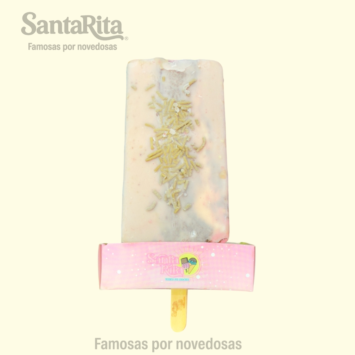 Paleta de crema elaborada con la receta especial de Santa Rita, preparada con una mezcla de frutas como papaya, kiwi, manzana, dátil y pasas. Cada mordida combina la suavidad cremosa con el sabor natural y la textura de las frutas, creando una experiencia premium, colorida y deliciosa.