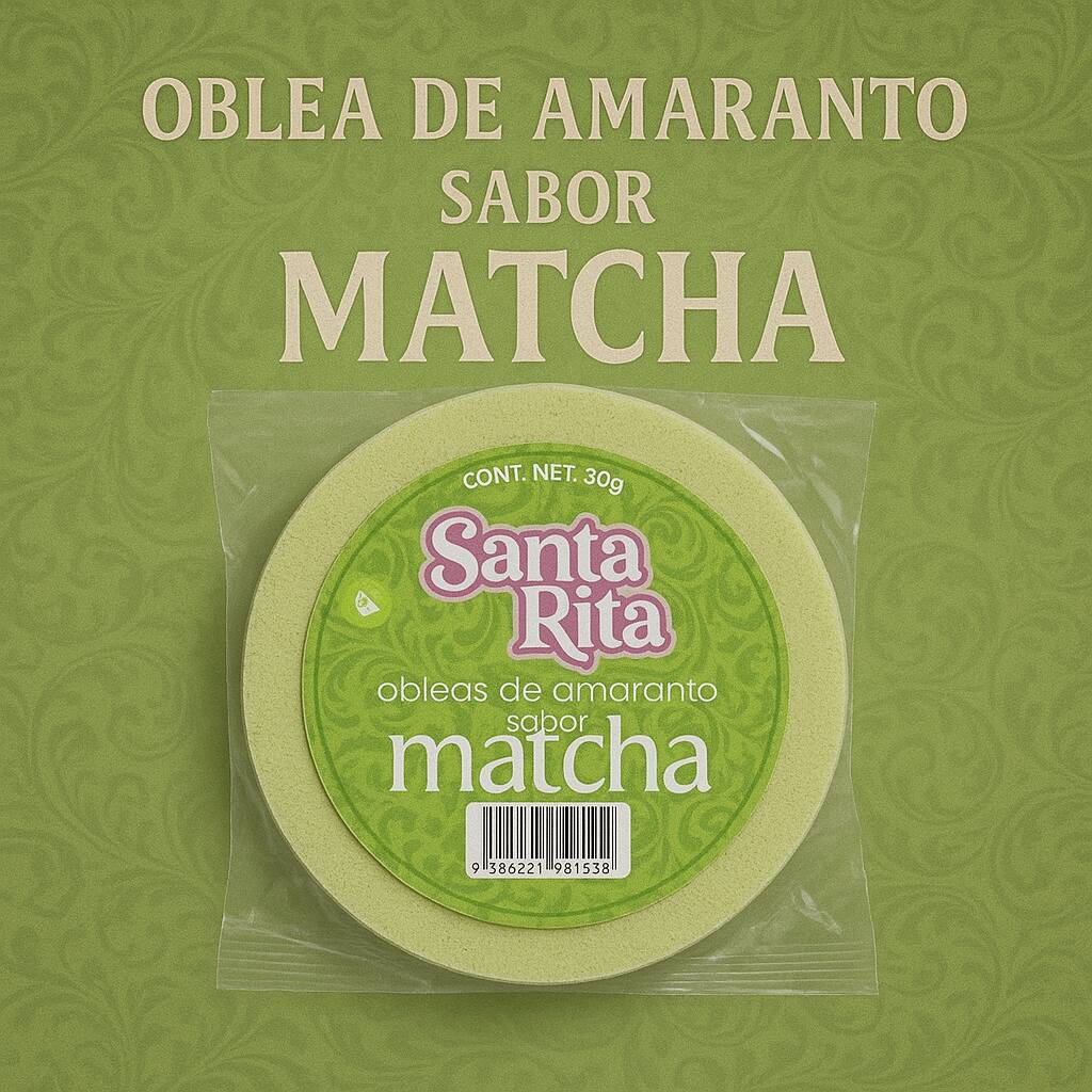 Crujiente oblea artesanal con sabor a té matcha. Su ligero toque herbal y dulce crea un equilibrio perfecto entre frescura y tradición. Un antojo original y delicioso con el toque de Santa Rita. 30 g