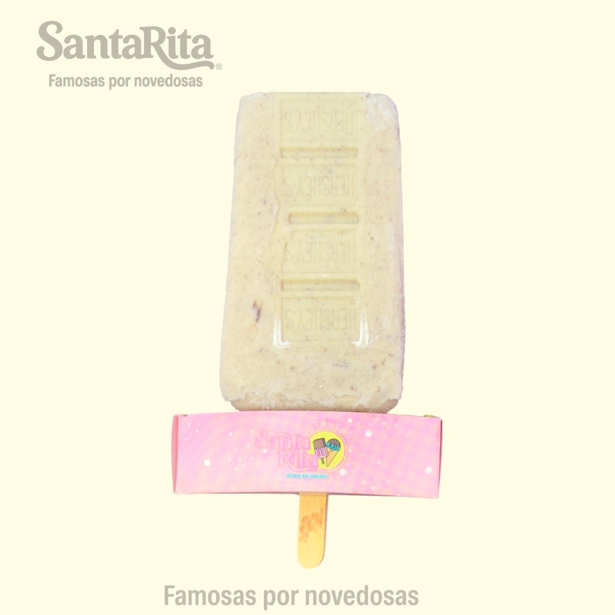 Paleta de crema inspirada en la icónica barra Hershey’s® Cookies & Cream, elaborada con una base cremosa de vainilla, trozos de galleta de chocolate y una barra completa del famoso chocolate incrustada en la paleta. En Santa Rita la convertimos en una experiencia premium con ingredientes de primera calidad.