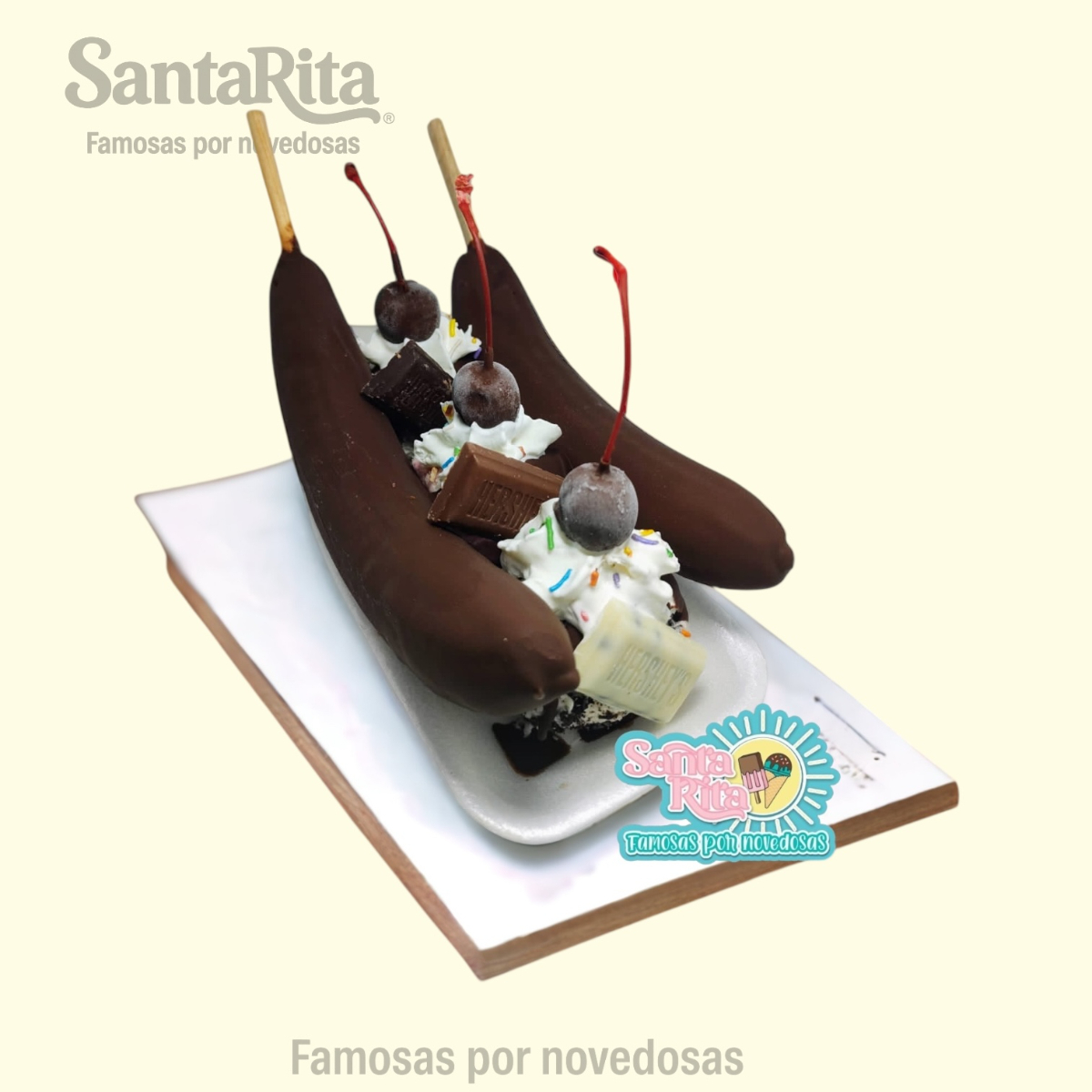 Clásica especialidad con tres bolas de helado, dos choco-bananas cubiertas de chocolate, crema batida, cerezas y mini Hershey’s. Una combinación fresca y deliciosa que en Santa Rita transformamos en una experiencia premium, llena de sabor y diversión en cada bocado.