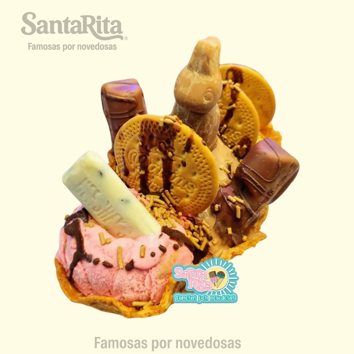 Waffle en forma de chalupa con tres bolas de helado, cobertura de chocolate, galletas Marías, crema batida y chocolates selectos como Kinder Bueno, Conejo Turín y mini Hershey’s. Se corona con el topping de tu elección para una experiencia suprema, deliciosa y única de Santa Rita.