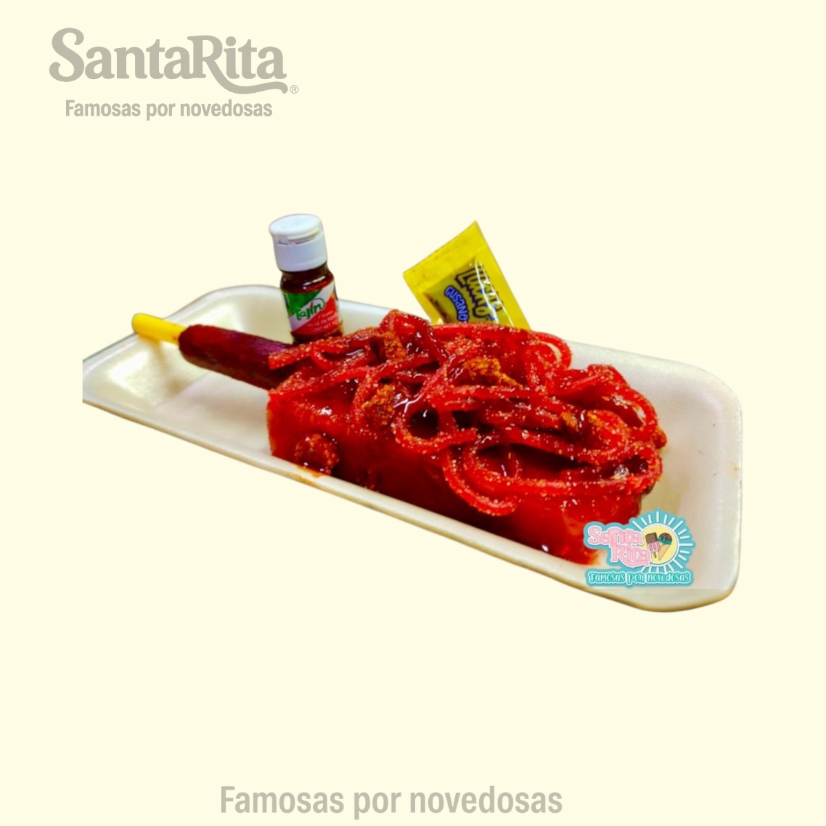 La clásica paleta preparada al estilo Santa Rita. Elaborada con una paleta de skwinkles con banderilla y cubierta con chamoy especial, chile en polvo, gomitas, mas skwinkles salsagueti y un toque de miguelito. Dulce, ácida y picosita, una explosión de sabor que conquista en cada mordida. 120 g