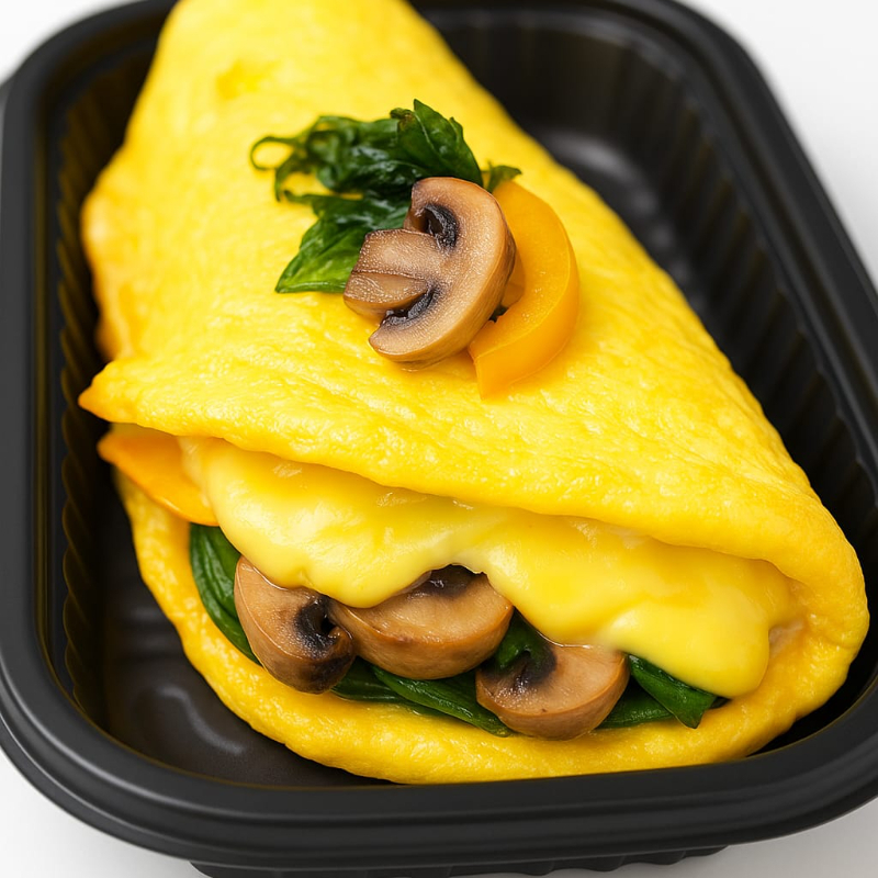 Omelette de 3 huevos con queso derretido, esponjoso y lleno de sabor. Puedes personalizarlo con jamón, champiñones o vegetales frescos. Ideal para un desayuno nutritivo y ligero.