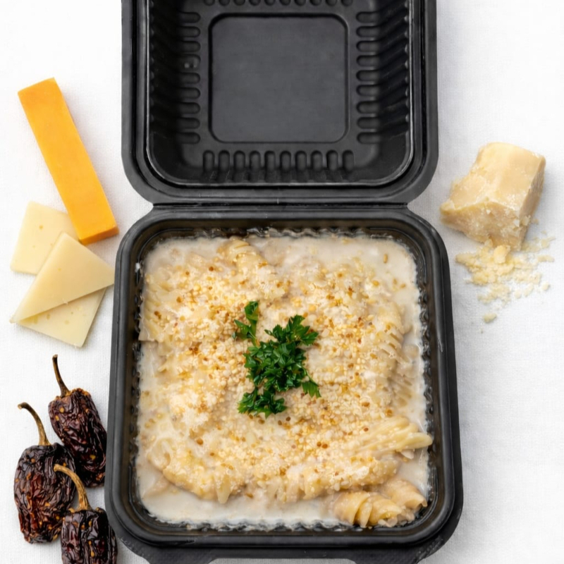 El más potente / signature Fusilli al dente con salsa cremosa de chipotle ahumado y cinco quesos. Potente, cremoso y memorable. Ideal si buscas pasta cremosa a domicilio en CDMX · Tláhuac. 350 g