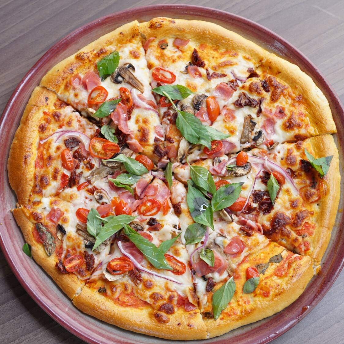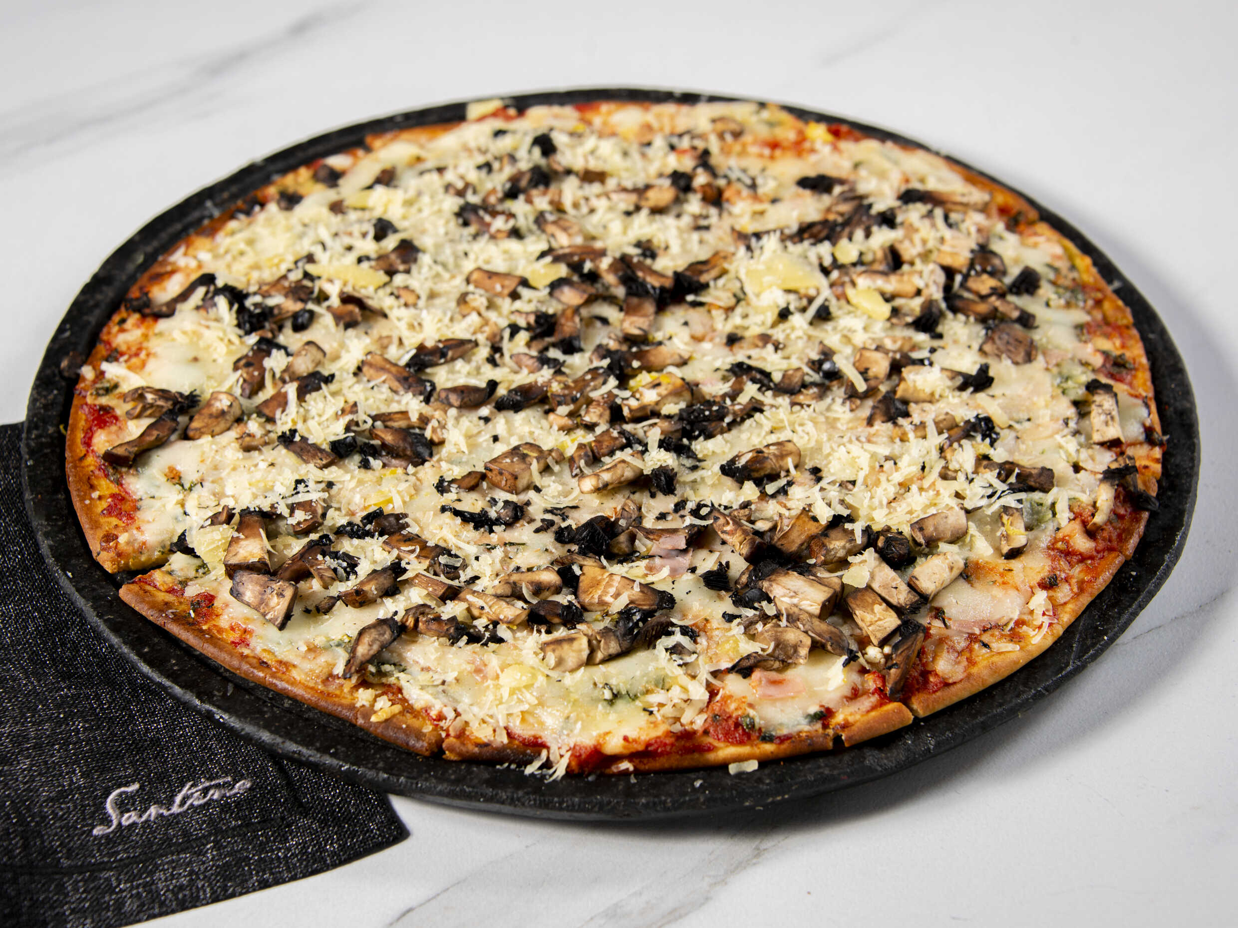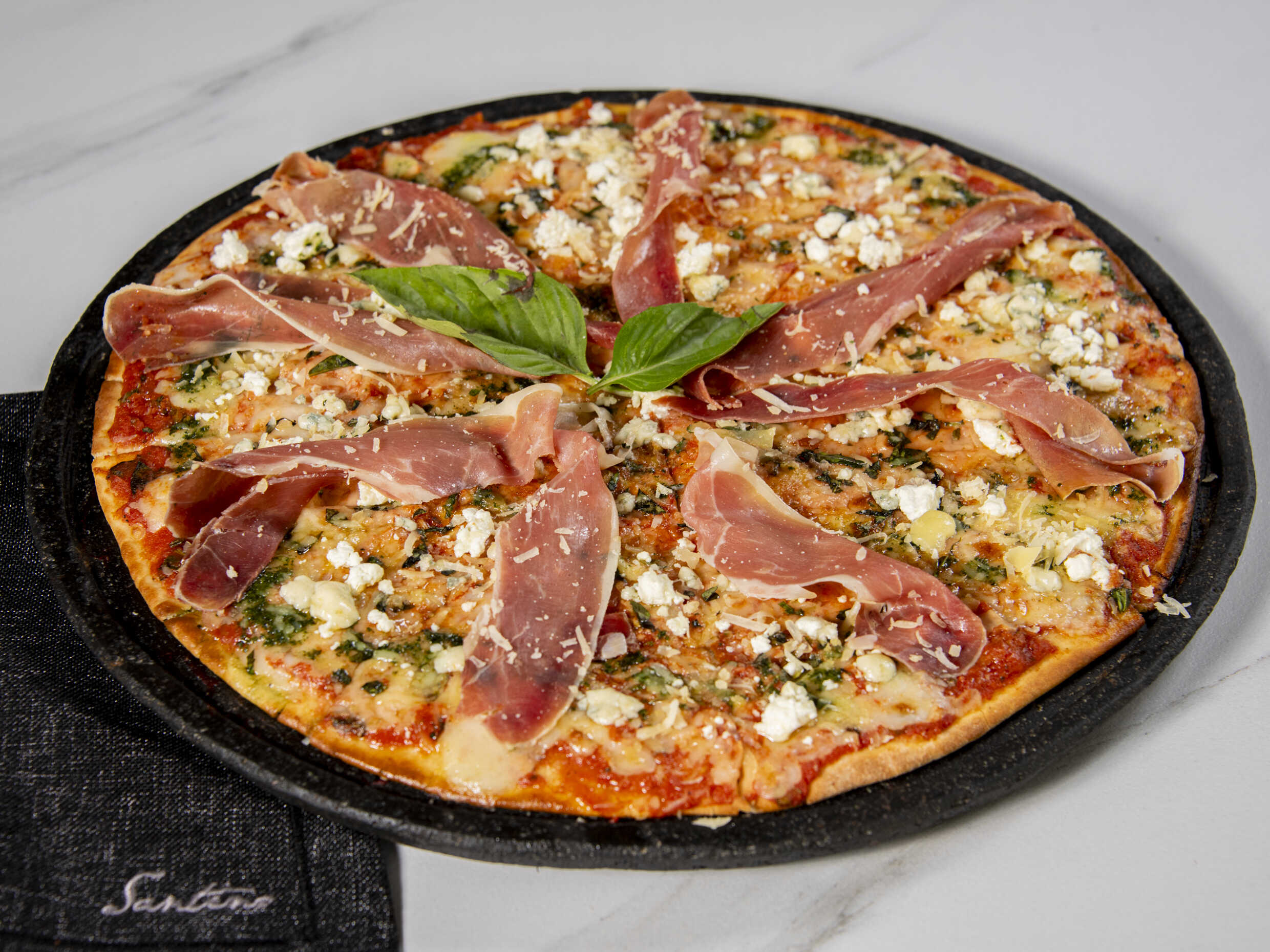 Queso gorgonzola, cabra, mozzarella y parmesano, con unas láminas de prosciutto fresco.